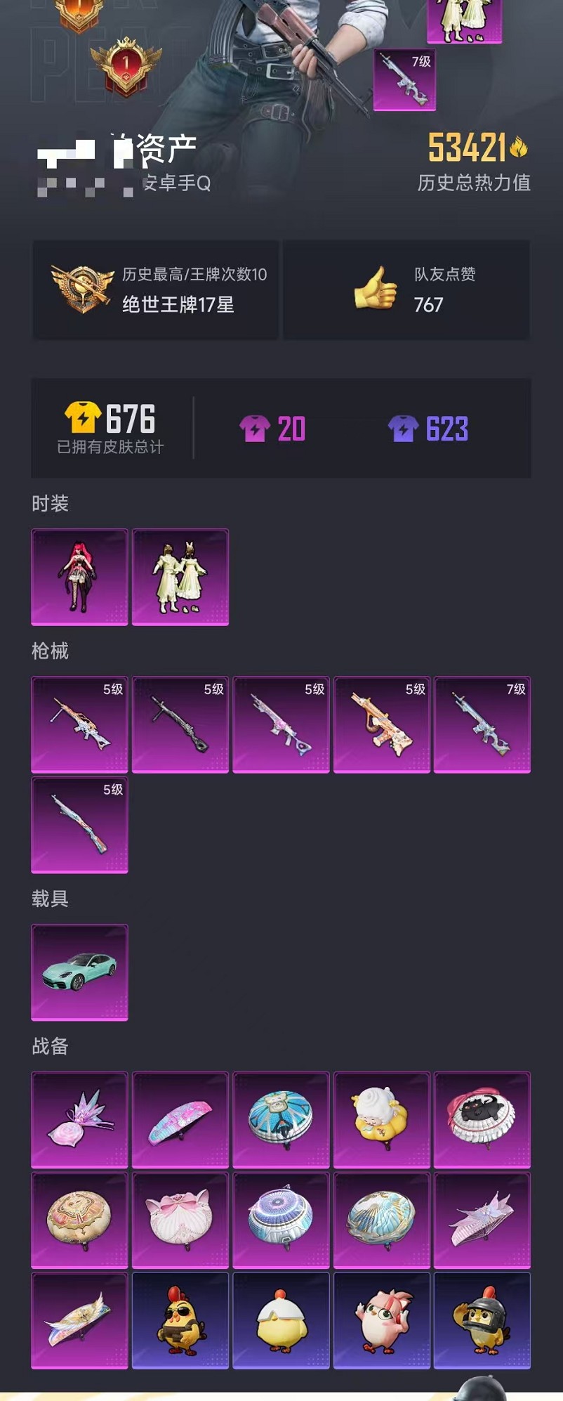 767-可二次【保时捷、2粉装6特效枪1载具可秒换绑】、安卓Q区-53421热力值-10印记-137套装-183枪皮、【1载具】、保时捷Panamera(梦幻青)【2粉装】、闲梦青缨、角色-绯穹魔姬【6特效枪】、MK12-雪月幻音(7级)、Mk14-甜梦熊击(5级)、Kar98K-巳巳如意(5级)、DP-28-豹影疾电(5级)、AUG-暖羊咩咩(5级)、MG-36-沧焰双生(5级)【29热门】、M416-蓝色火焰、GROZA-彩虹符号、长空猛禽、牛气冲天、浪漫天命、雪山精英(老6服)、破蛋小黄鸡