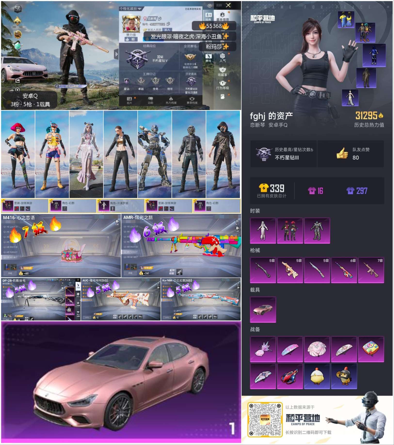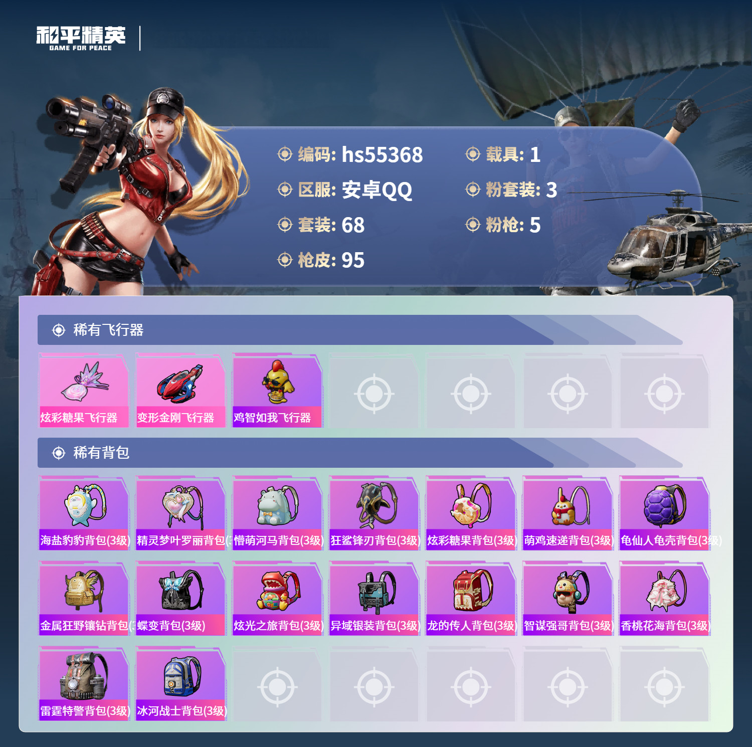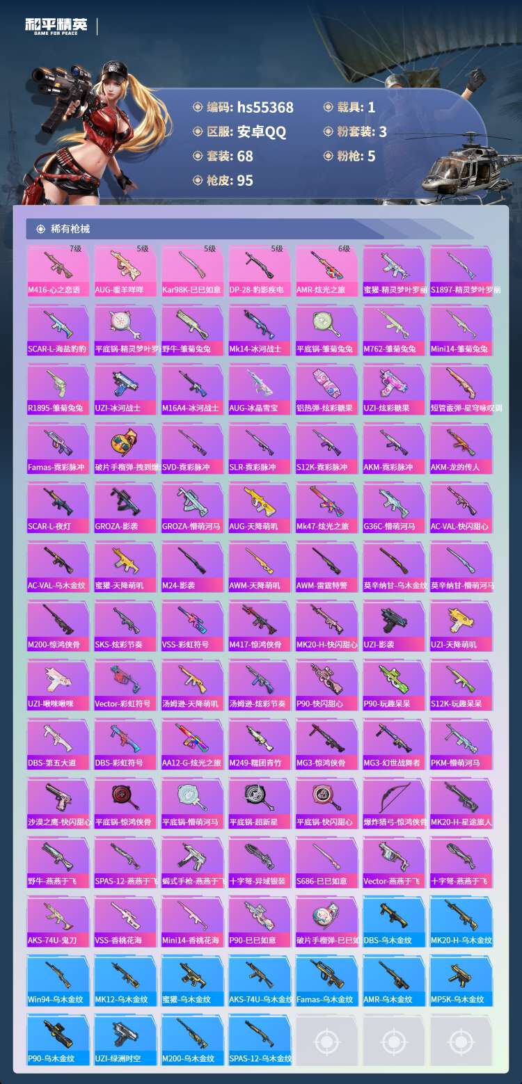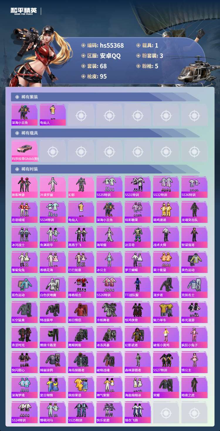 hs55368 安卓手Q-0王牌印记-3粉装-5特效枪-1载具-31680热力值-68套装-95枪皮