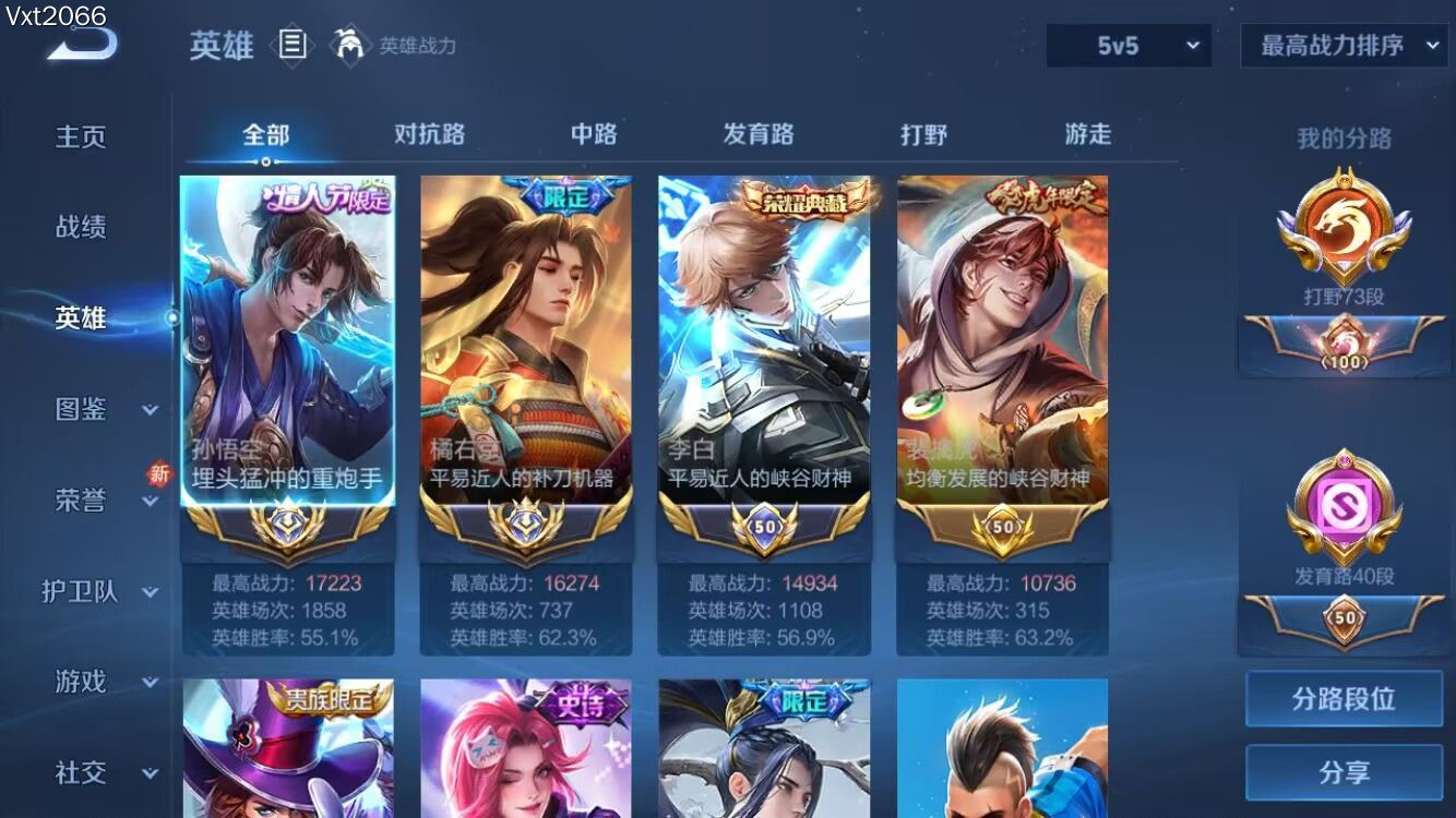 皮肤240 英雄126 荣耀王者 荣耀典藏1 传说18 其他皮肤102-3热门国标打野,大国孙悟空1.7,大国橘右京1.6,国标李白近1.5,金标裴擒虎,73段打野,永久小