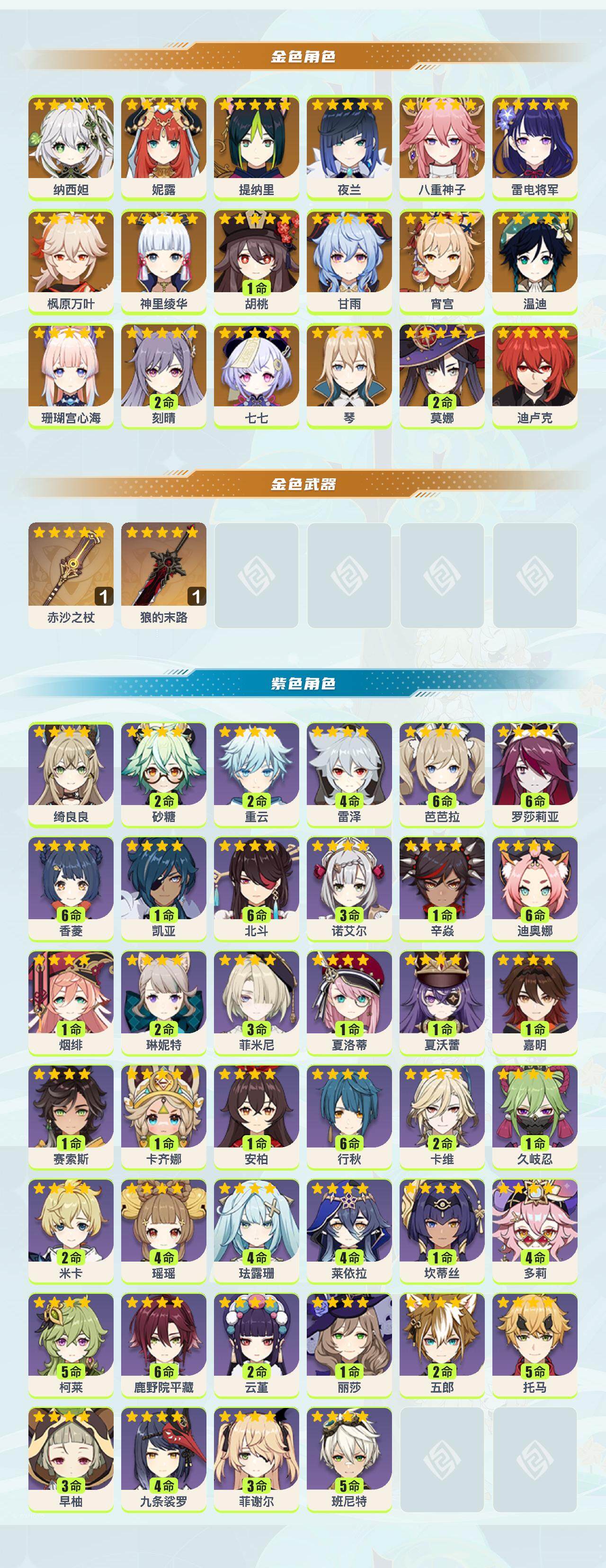 【YSYT397】58级/女主/19个五星角色/纳西妲/妮露/提纳里/夜兰/八重神子/珊瑚宫心海/雷电将军/宵宫/神里绫华/枫原万叶/1命胡桃/甘雨/温迪/琴/2命刻晴/迪卢克/2命莫娜/七七/赤沙之杖/狼的末路/卡齐娜/赛索斯/1命嘉明/夏沃蕾/夏洛蒂/3命菲米尼/2命琳妮特/绮良良/2命卡维/2命米卡/4命瑶瑶/4命珐露珊/4命莱依拉/1命坎蒂丝/4命多莉/5命柯莱/满命鹿野院平藏/久岐忍/2命云堇/2命五郎/5命托马/4命九条裟罗/3命早柚/1命烟绯/满命罗莎莉亚/辛焱/满命迪奥娜/2命砂