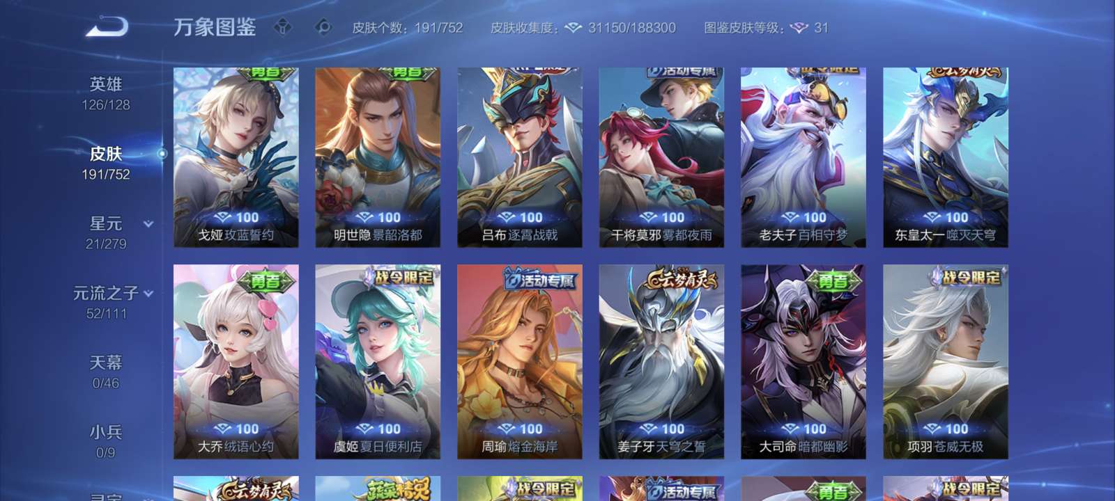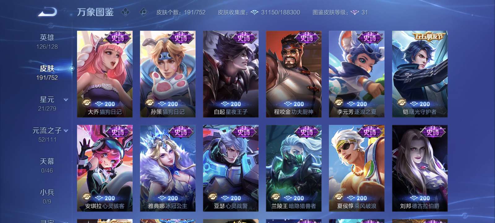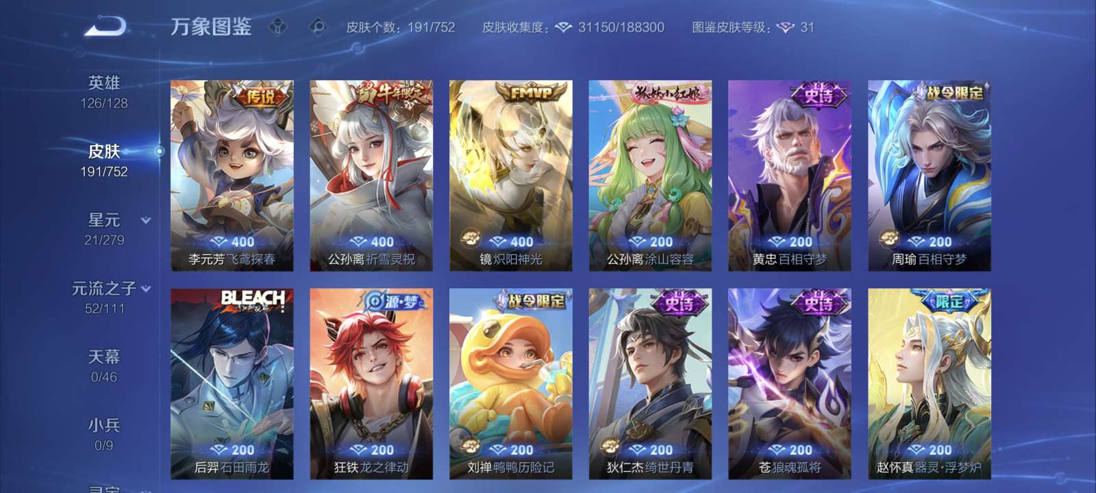 皮肤191 英雄126 非凡王者 荣耀典藏1 无双皮肤1 珍品传说3 传说10 其他皮肤78-3百战