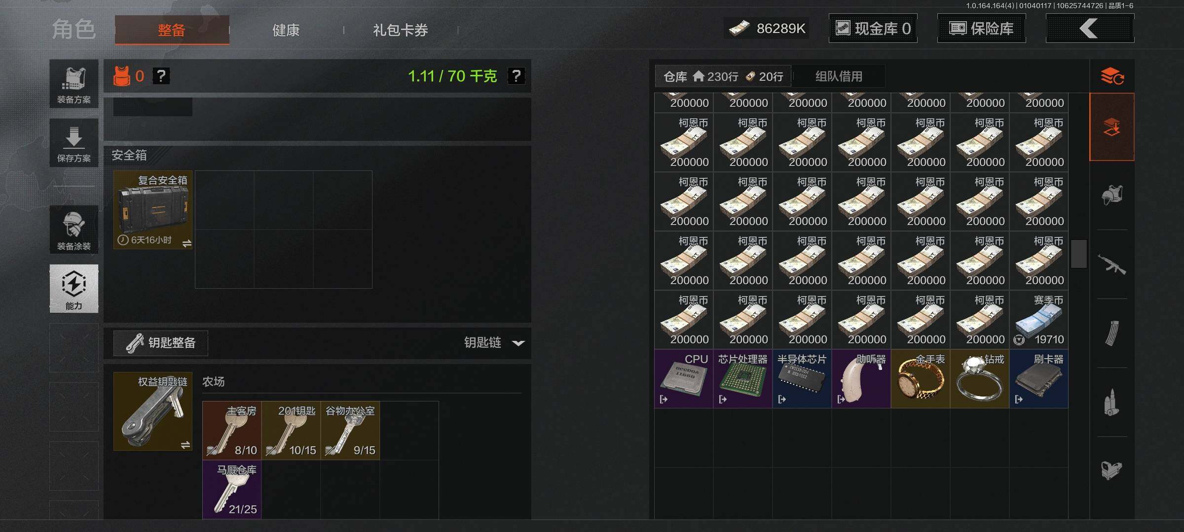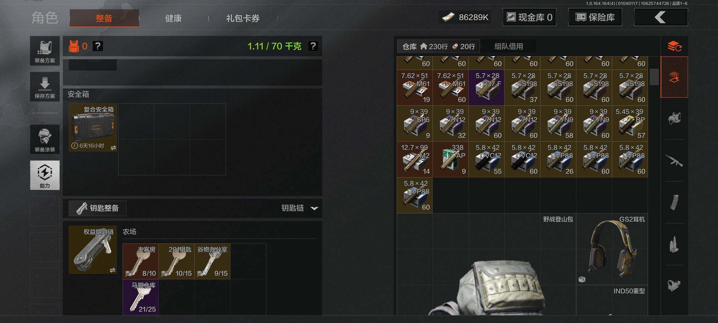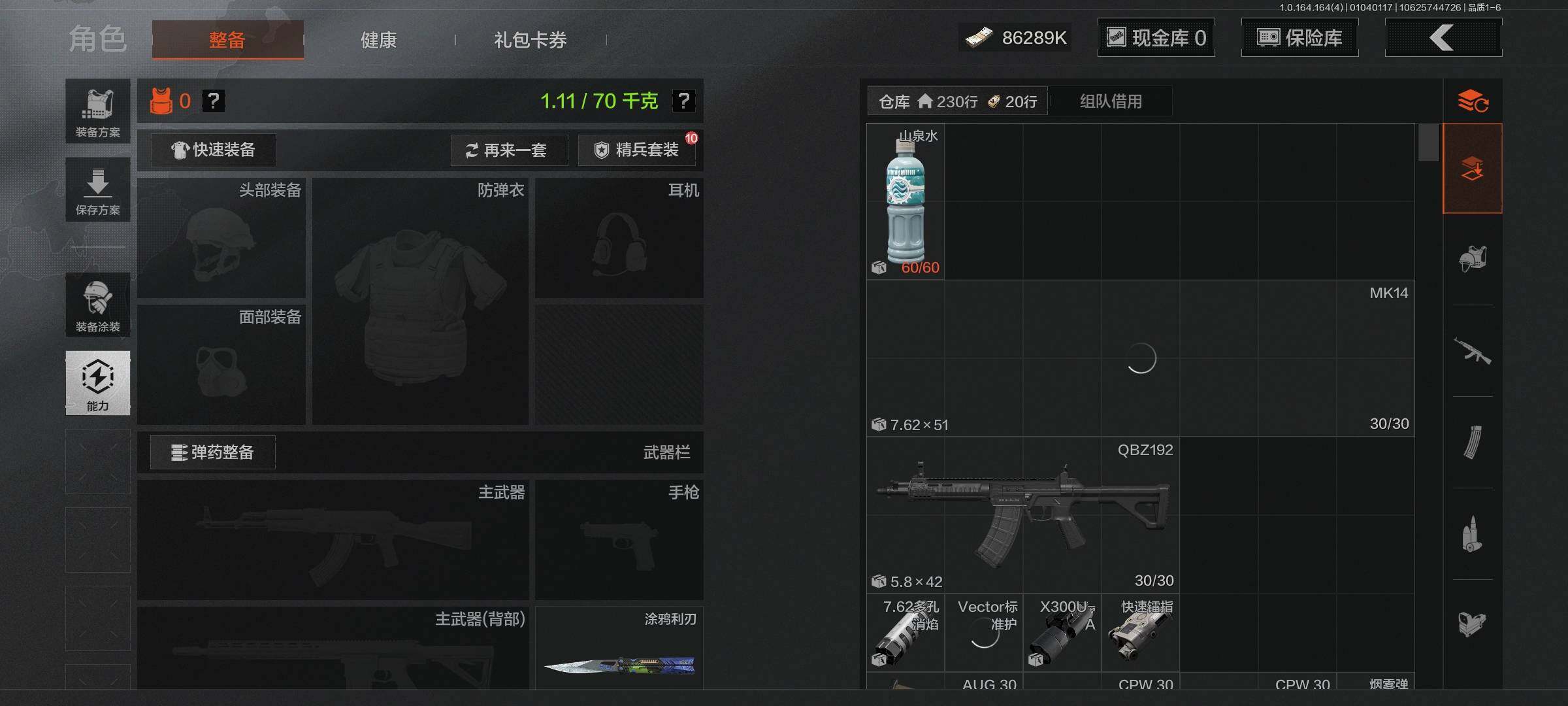 等级:30/段位:暗区传说/仓库价值(百万):89.6/柯恩币:86289000/