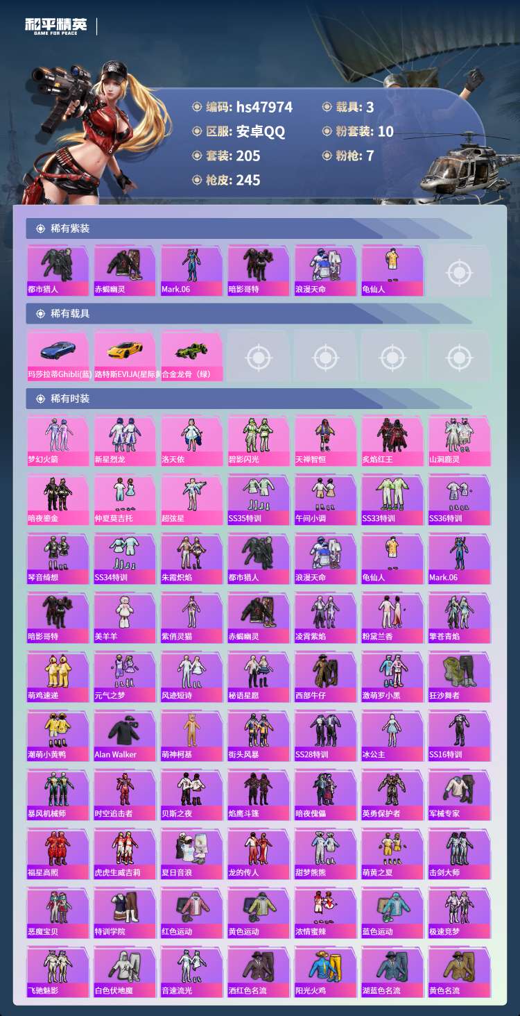 hs47974 安卓手Q-13王牌印记-10粉装-7特效枪-3载具-85519热力值-205套装-2