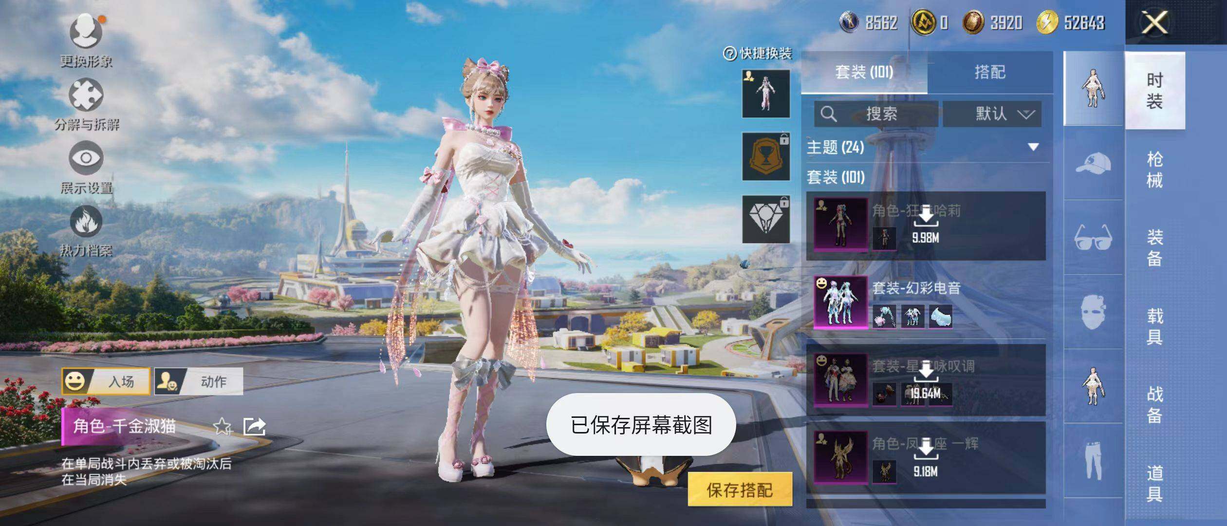 【粉色套装】:角色-千金淑猫,角色-凤凰座 一辉,粉装-星穹咏叹调,粉装-幻彩电音,角色-狂魅哈莉,角色-冷漠罗丽,角色-绯月迷踪,角色-宁雨蝶