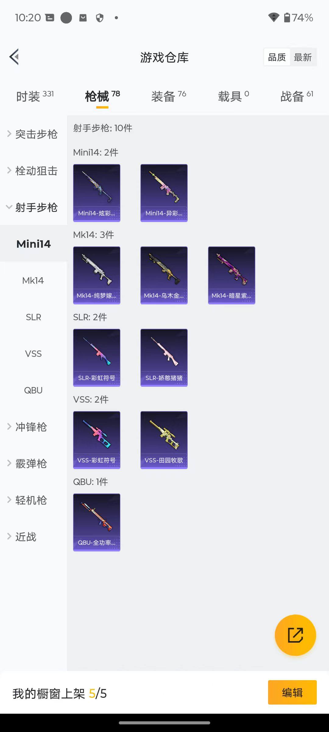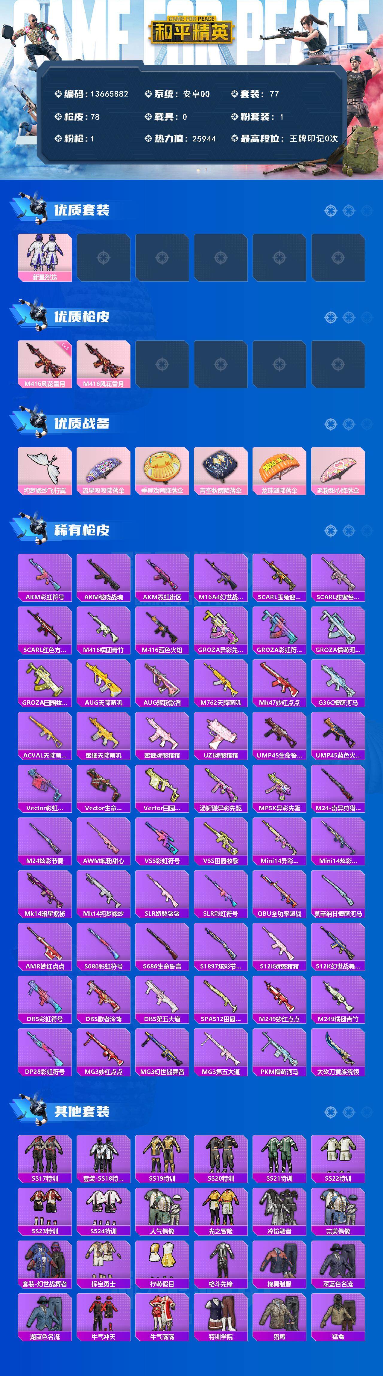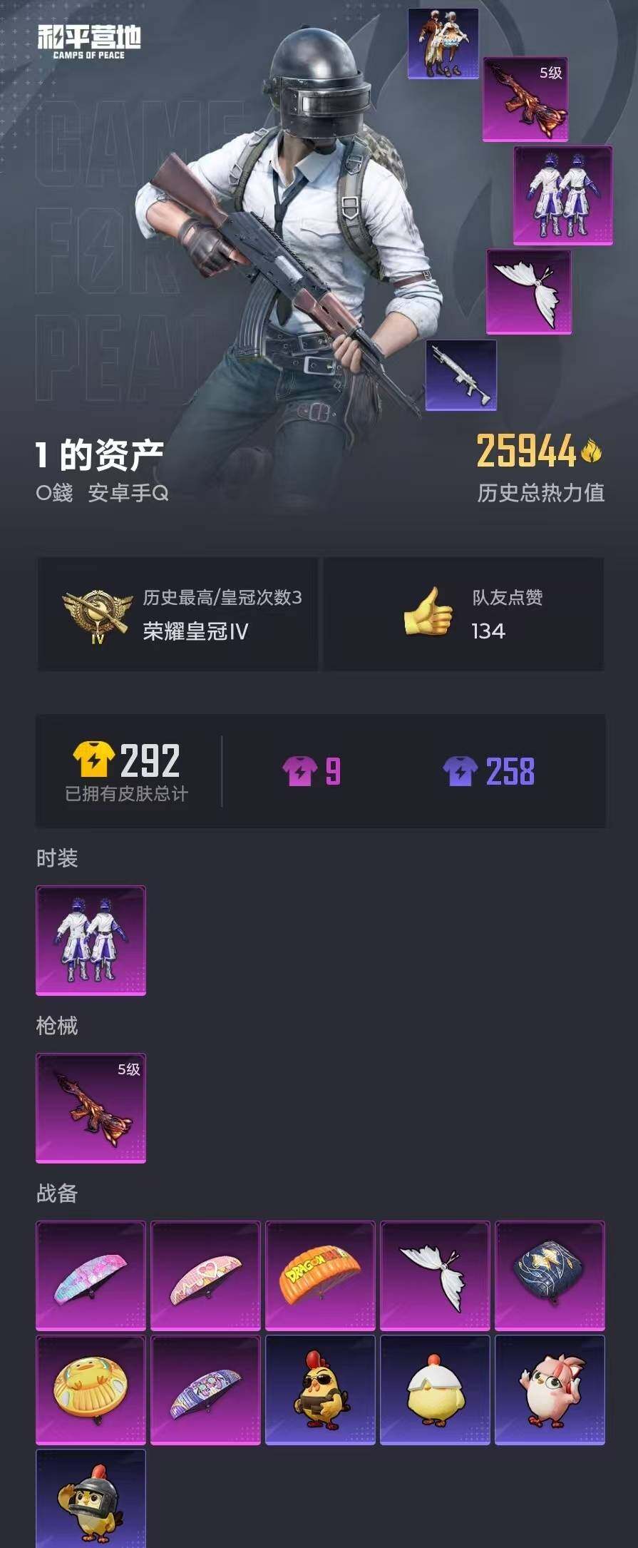 77套装/枪械1/装备76/战备61/热力值25944/五级M416-风花雪月/套装-龟仙人/新星烈龙/M416-风花雪月/纯梦嫁纱飞行翼/流星咚咚降落伞/垂柳戏鸭降落伞/青空秋雨降落伞/龙珠超降落伞/飒粉甜心降落伞/炫彩糖果降落伞/龟仙人/AKM-彩虹符号/AKM-破晓战魂/AKM-霓虹街区/M16A4-幻世战舞者/SCAR-L-玉兔迎春/SCAR-L-甜蜜誓约/SCAR-L-红色方程式/M4