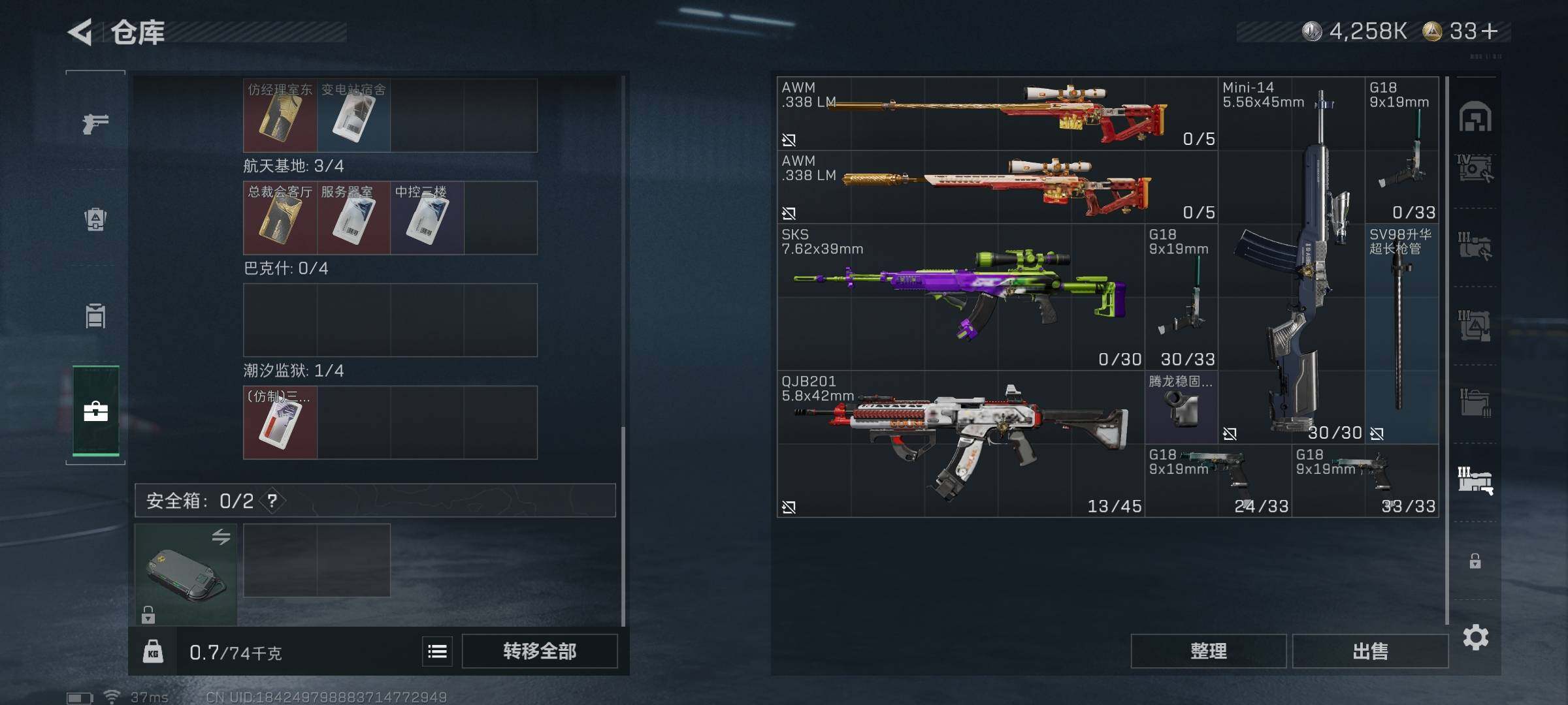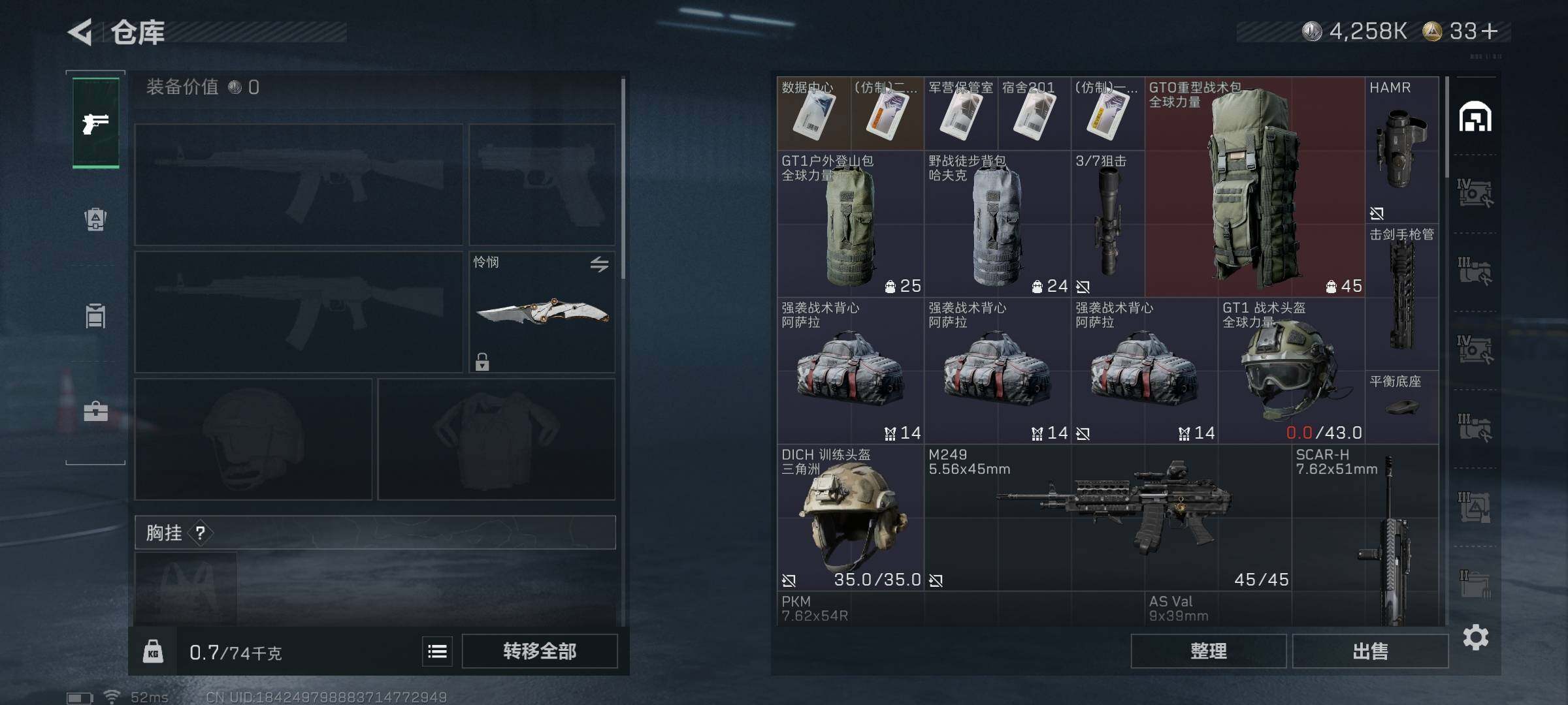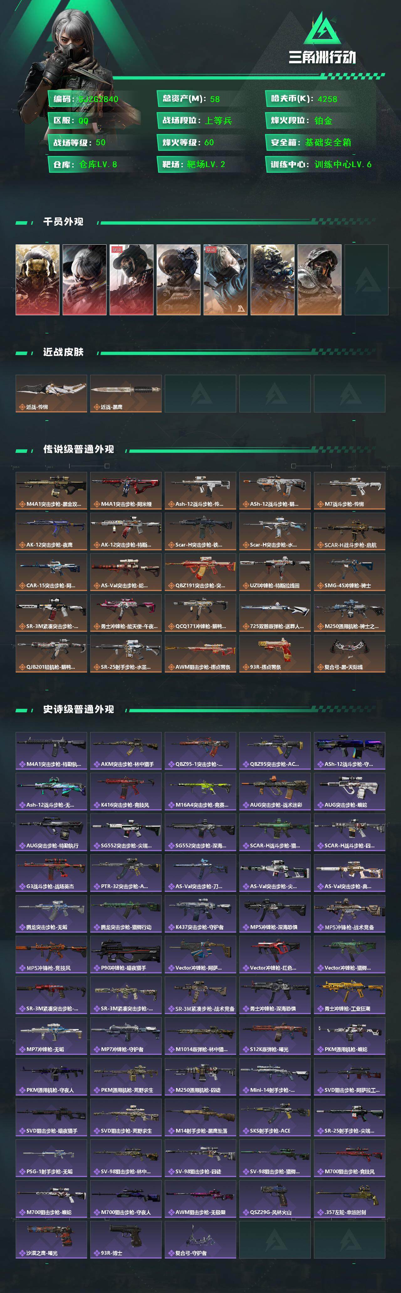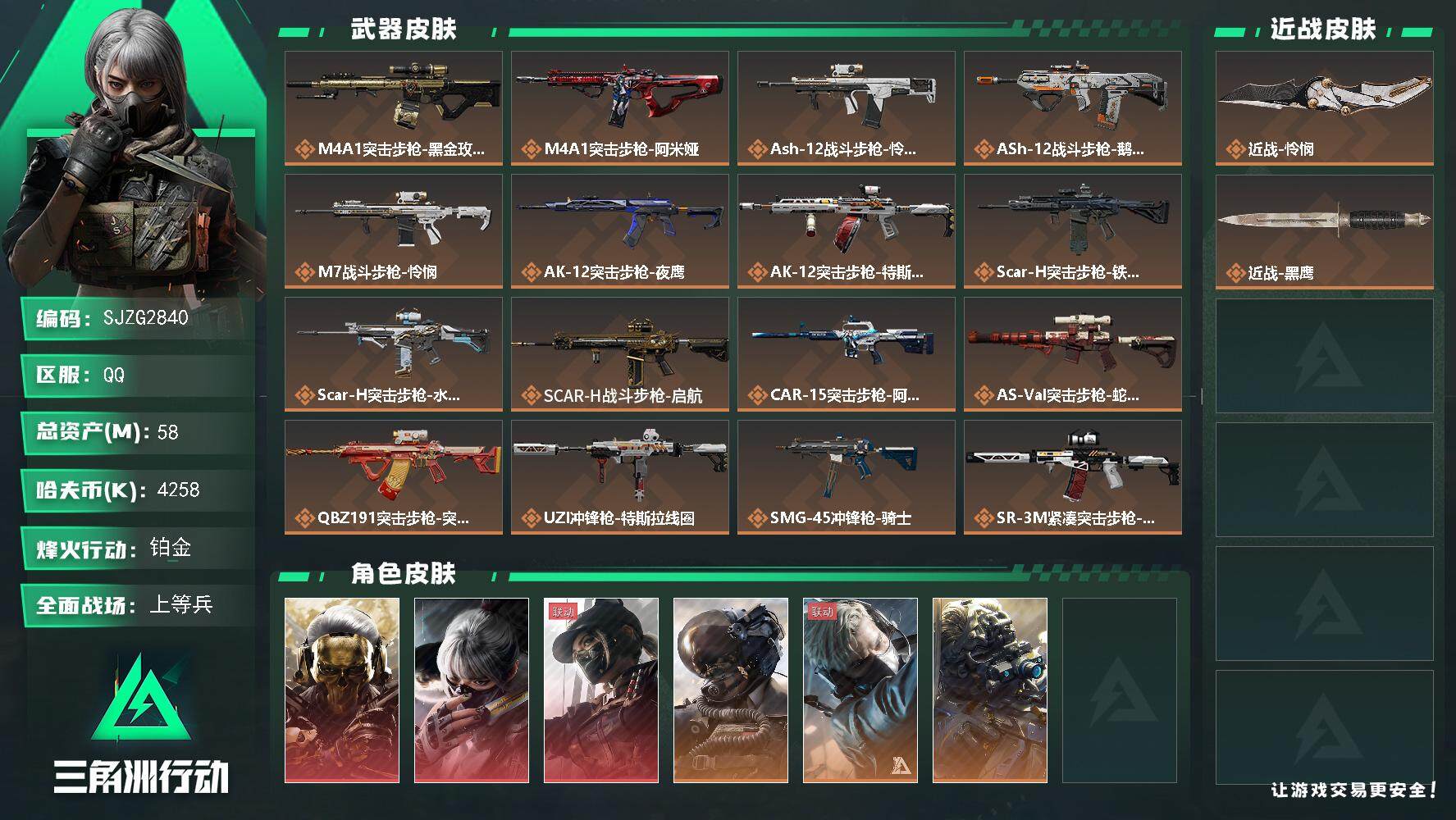 总资产(M):58M/哈夫币(K):4258K/哈夫币(K):4258K/传说枪皮数:25/全面战场