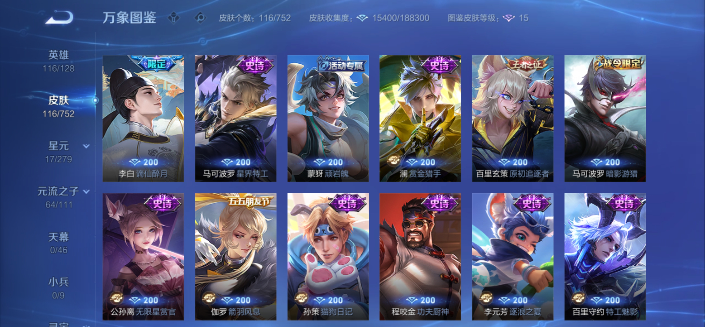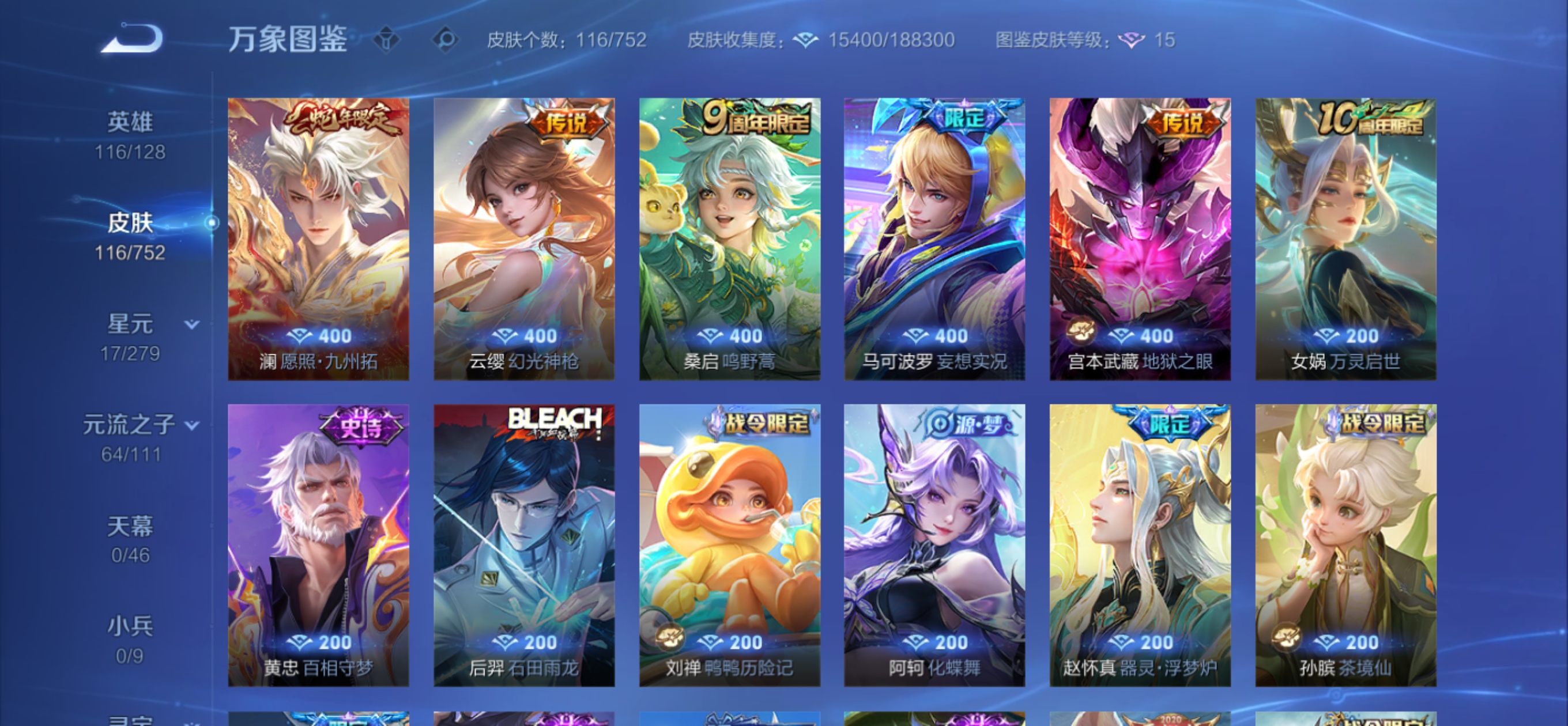 皮肤116 英雄116 非凡王者 传说5 其他皮肤36-安卓q哲想开心铭文基本全满