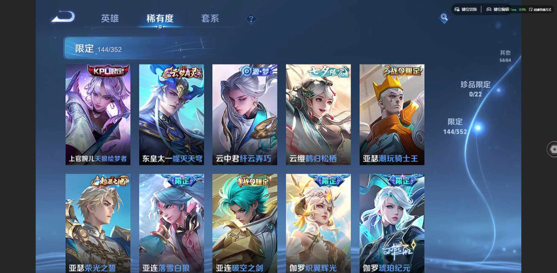 【小国标廉颇】贵族等级: V8 英雄数: 127 皮肤数: 373 荣耀水晶: 赤影疾锋,银白咏叹调 星传说: 未来机甲,幽冥之眼 传说皮: 黄金狮子座,黄金射手座,冠军飞将,云鹰飞将,炽阳神光,一念神魔,末日机甲-孙尚香,地狱之眼,超时空战士-狄仁杰,无双飞将,山海·炽霜斩,炽翼辉光,鹤归松栖(云缨),澜逐花归海,乘龙·淬吴钩,落雪白狼,黄金天蝎座,铠冥王哈迪斯,