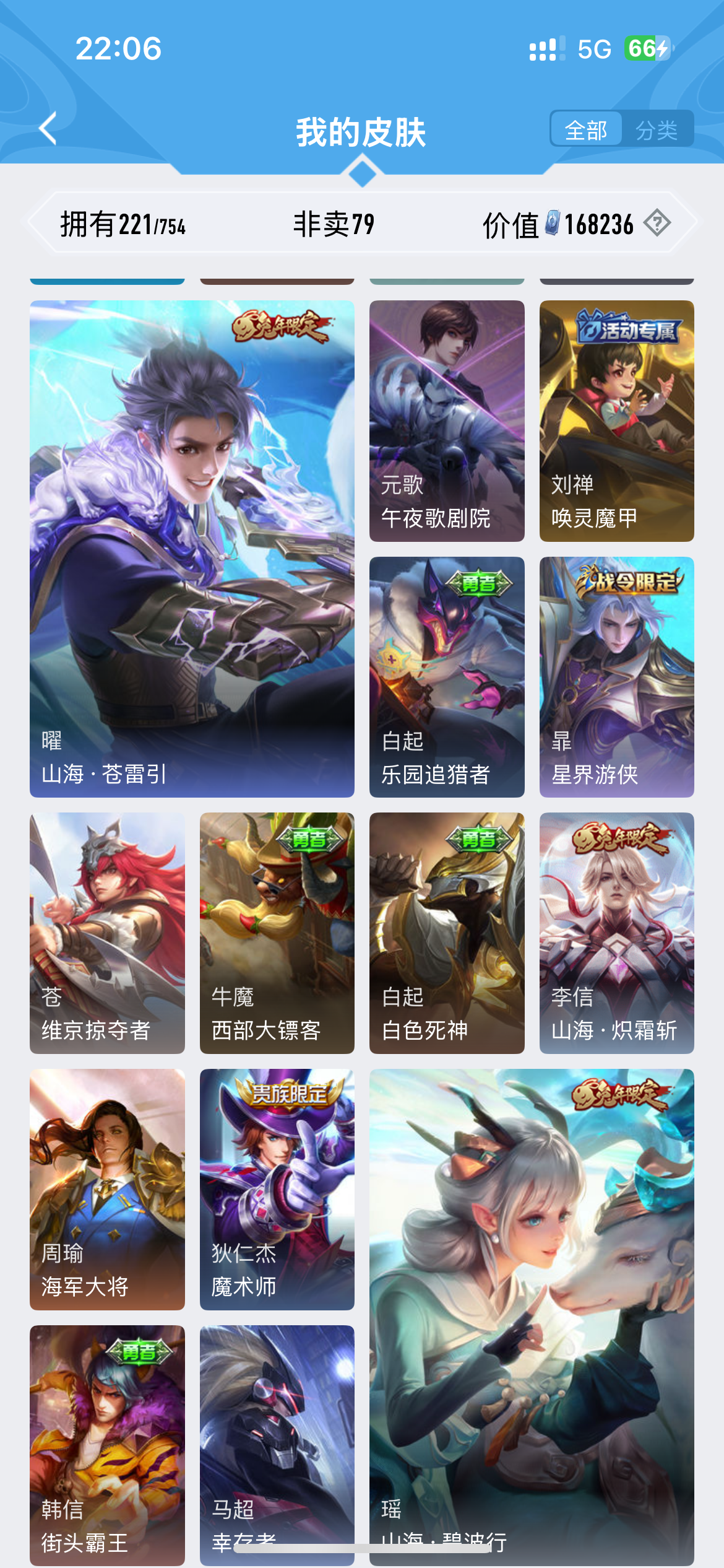 皮肤221 英雄126 荣耀典藏1 传说13 其他皮肤72-多账号游戏 火影 暗区 金铲铲
