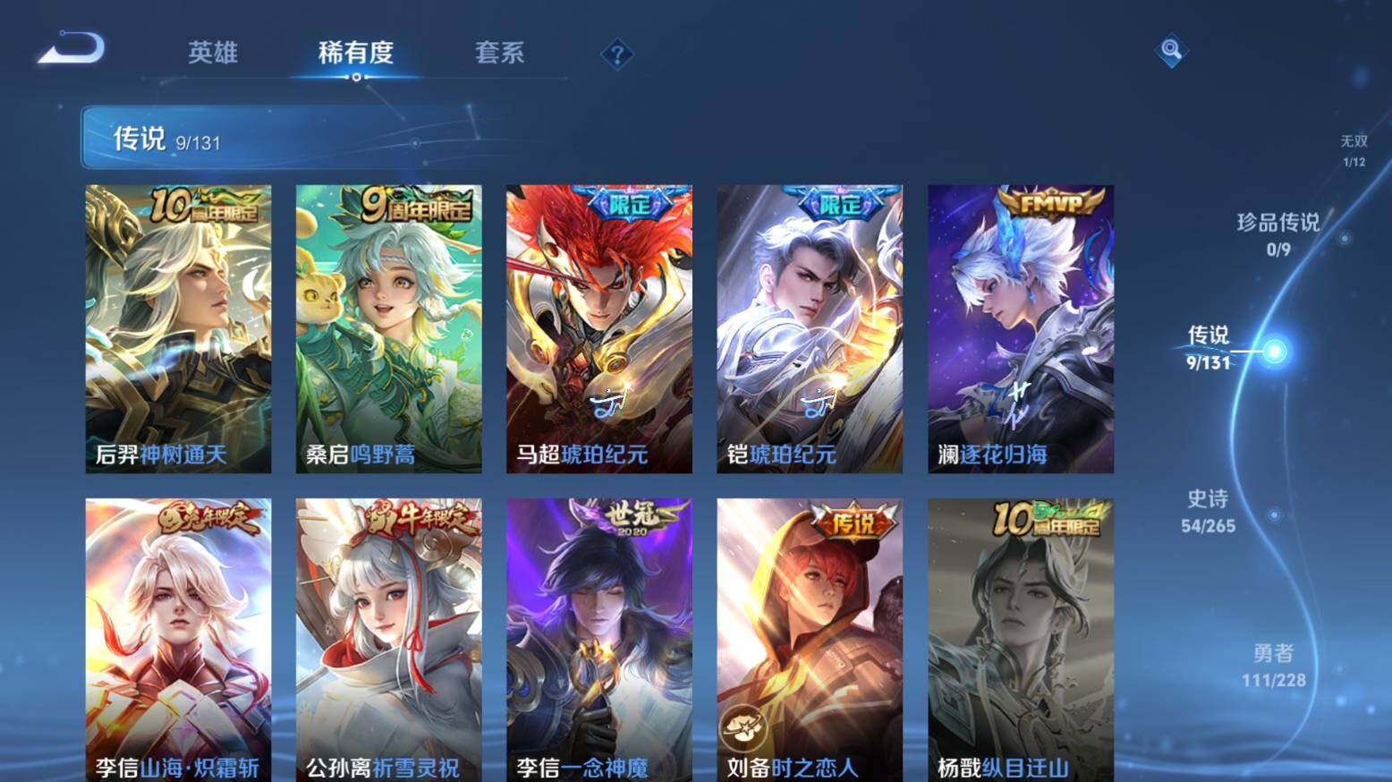 【传说皮肤】:后羿神树通天,桑启鸣野蒿,马超琥珀纪元,铠琥珀纪元,澜逐花归海,李信山海炽霜斩,公孙离祈雪灵祝,李信一念神魔,刘备时之恋人