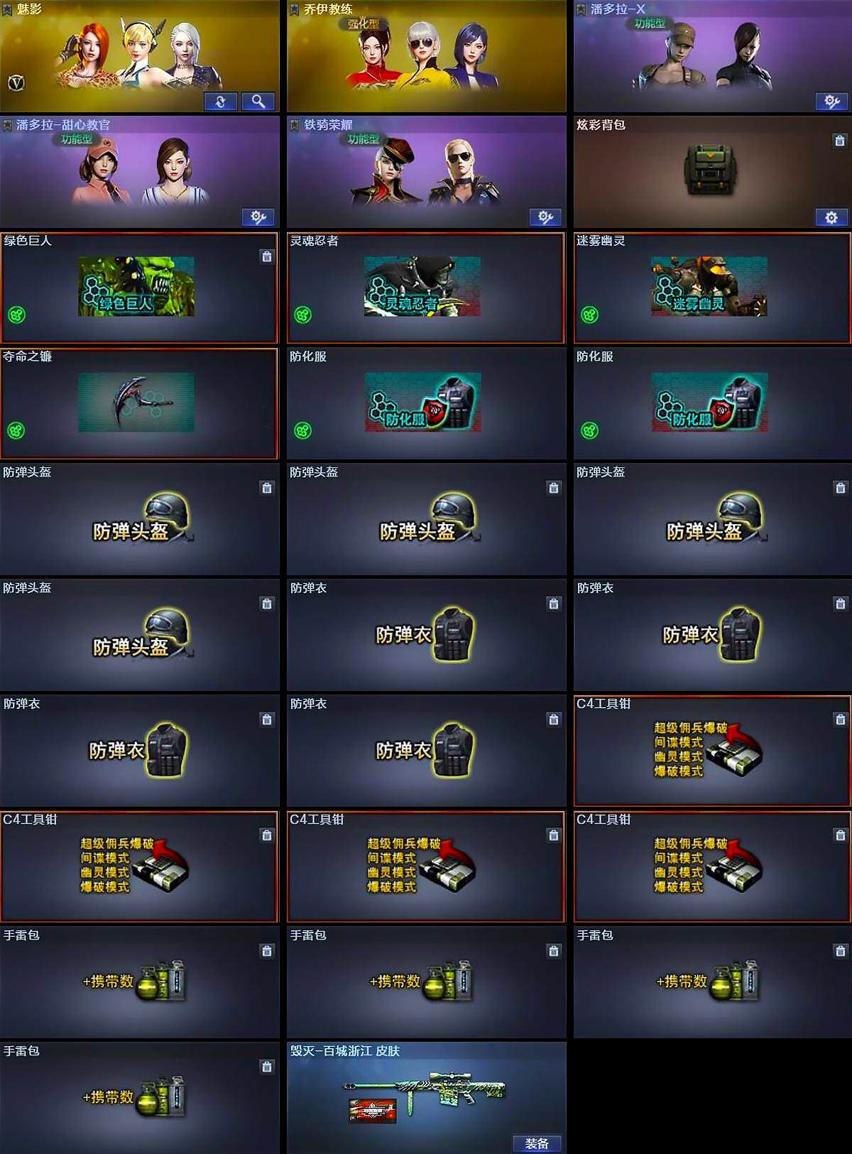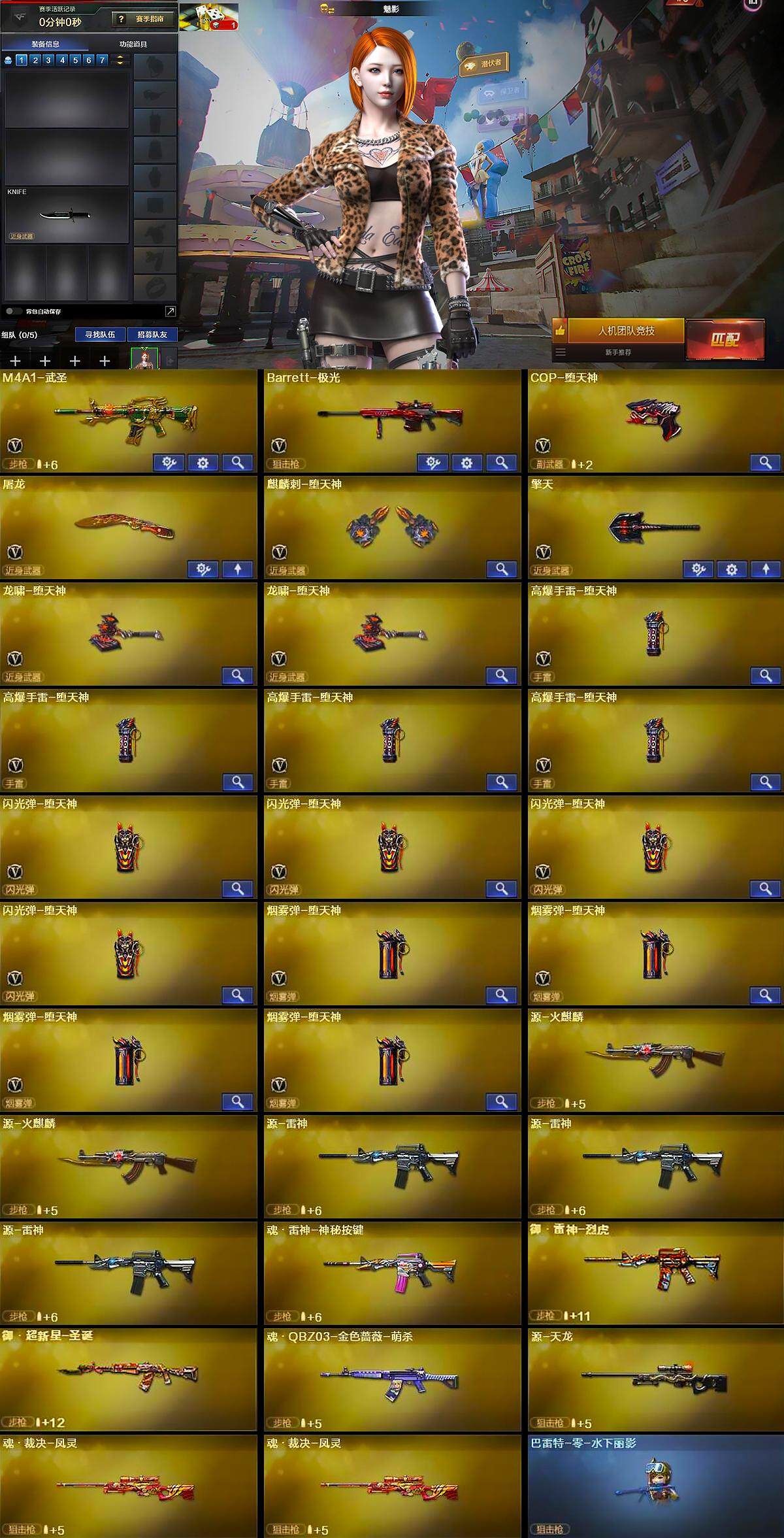 【英雄级武器】:M4A1-武圣,Barrett-极光,COP-堕天神,屠龙,麒麟刺-堕天神,擎天,龙啸-堕天神*2,高爆手雷-堕天神*4,闪光弹-堕天神*4,烟雾弹-堕天神*4