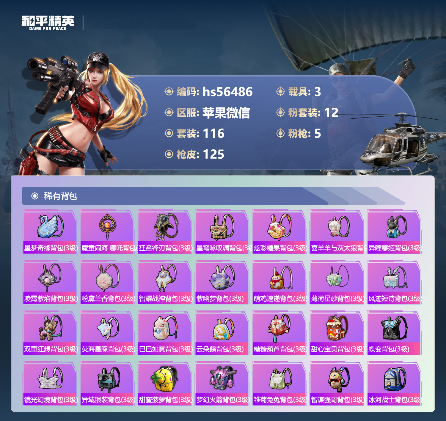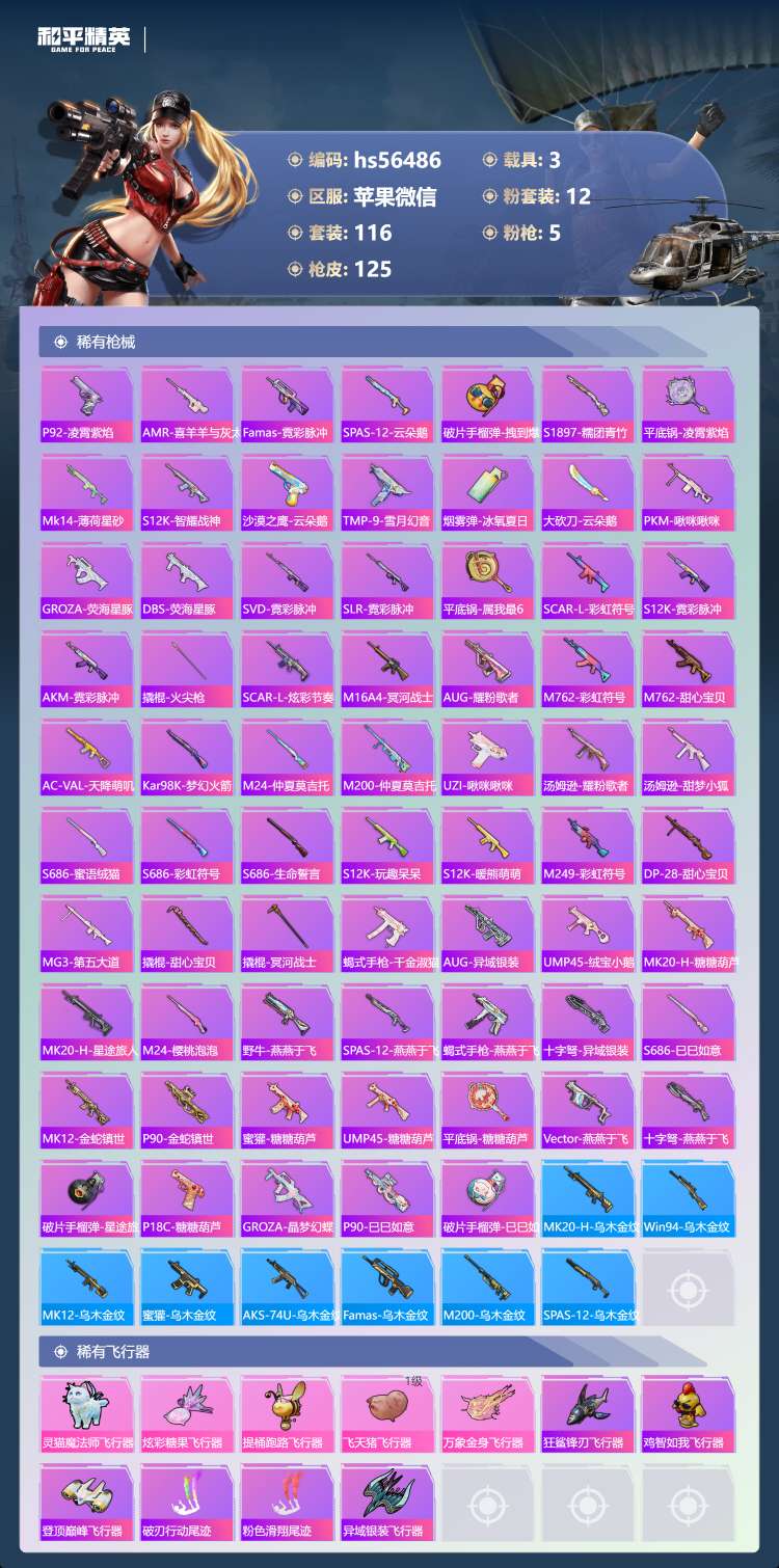 hs56486 苹果微-8王牌印记-12粉装-5特效枪-3载具-45552热力值-116套装-12