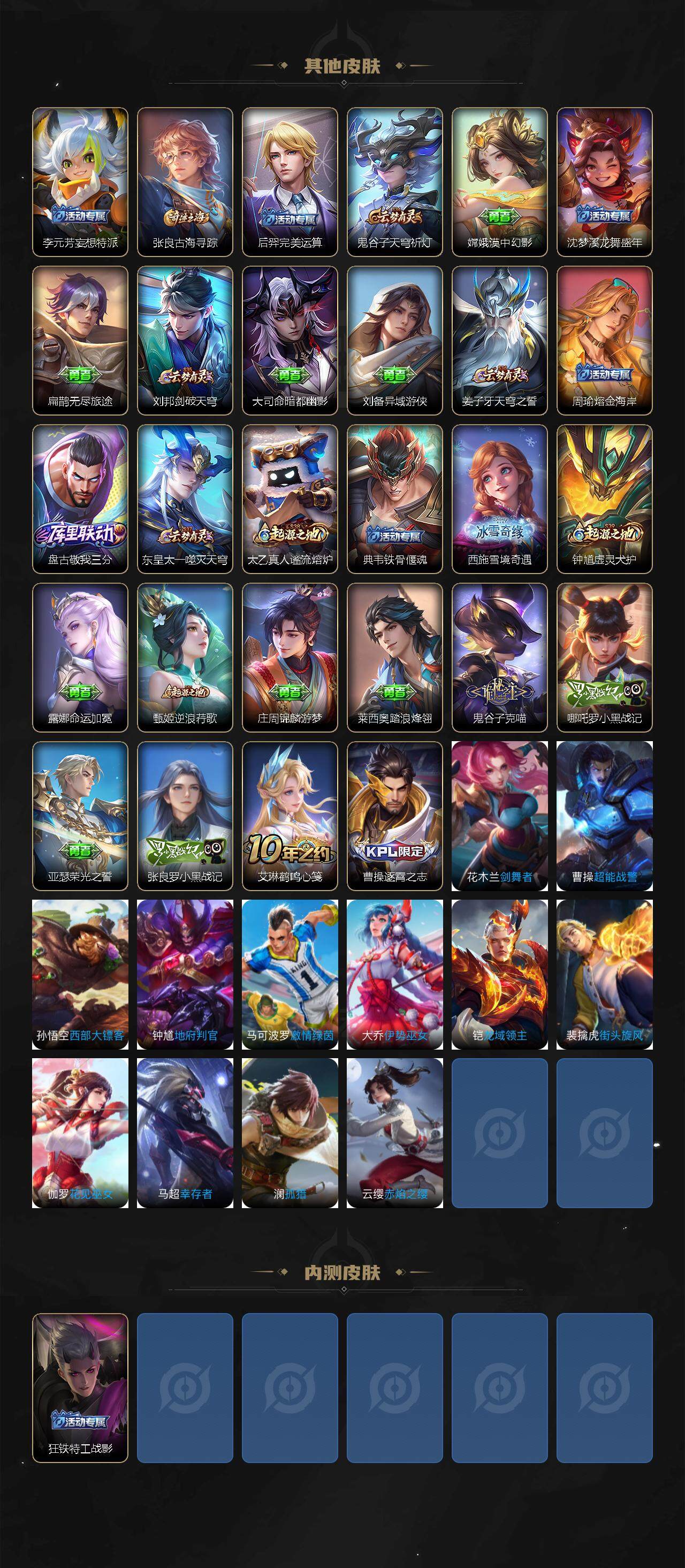 【限定皮肤】:蒙犽顽岩魄,姜子牙天穹之誓,狄仁杰阴阳师,项羽海滩派对,孙悟空至尊宝,李元芳云中旅人,鬼谷子五谷丰年,裴擒虎李小龙,裴擒虎擒涛扼浪,鲁班大师探海日志,桑启海盐诗旅,阿古朵江河有灵,张良古海寻踪,鬼谷子天穹祈灯,