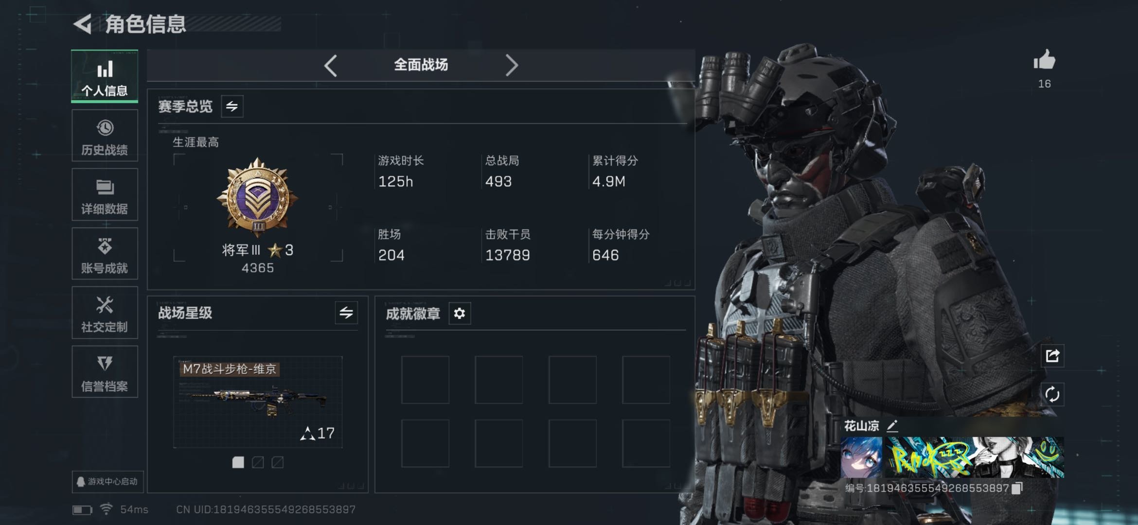 hssjz761 总资产224.85M,哈夫币 84298.71K,战场等级:50 校官,行动等级: