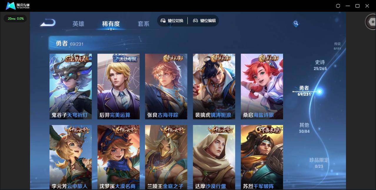 实名: 可修改 贵族等级: V6 英雄数: 117 皮肤数: 125 荣耀水晶