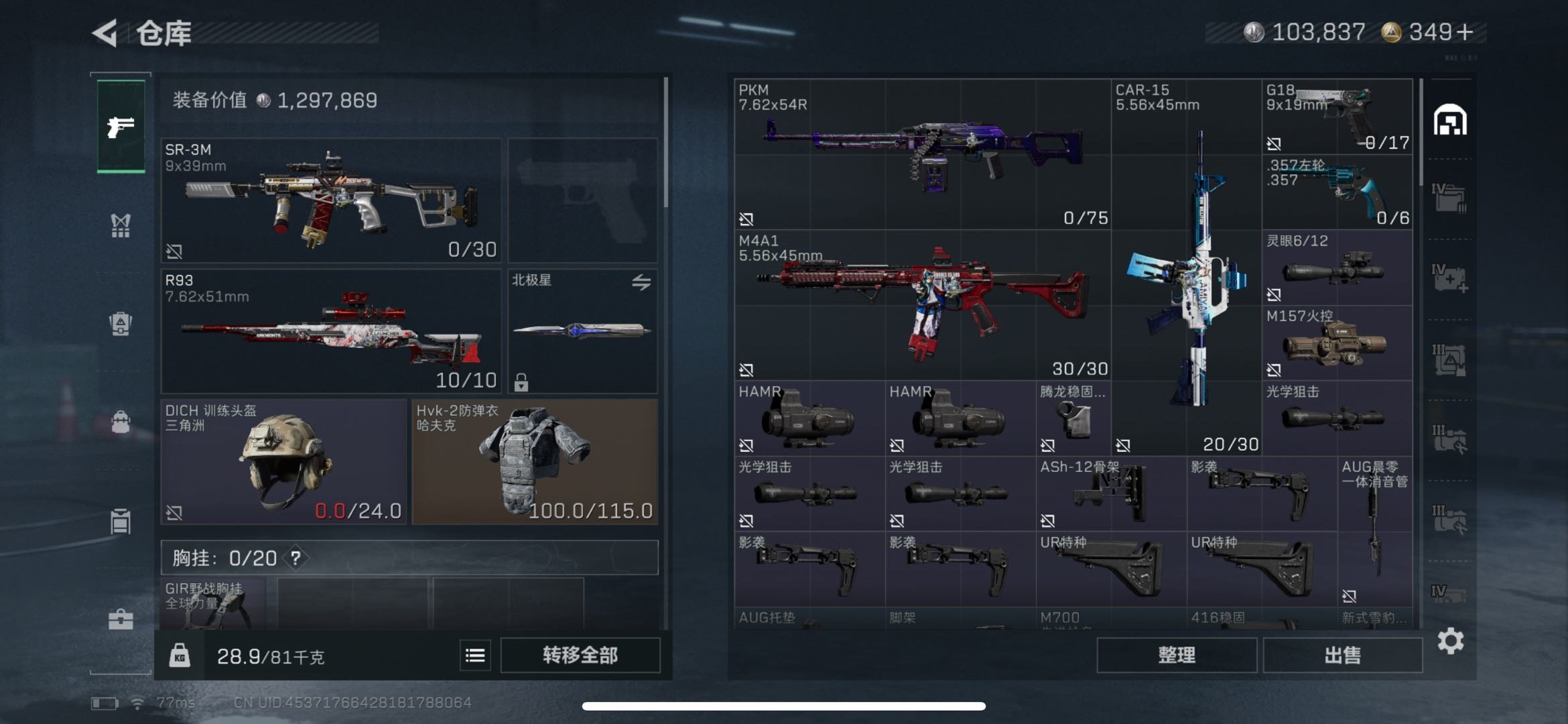 总资产66.41M,哈夫币 103.84K,战场等级:50 上等兵,行动等级:60 钻石,角色皮肤7