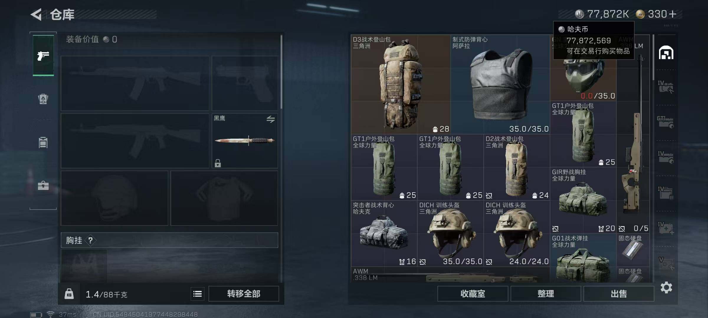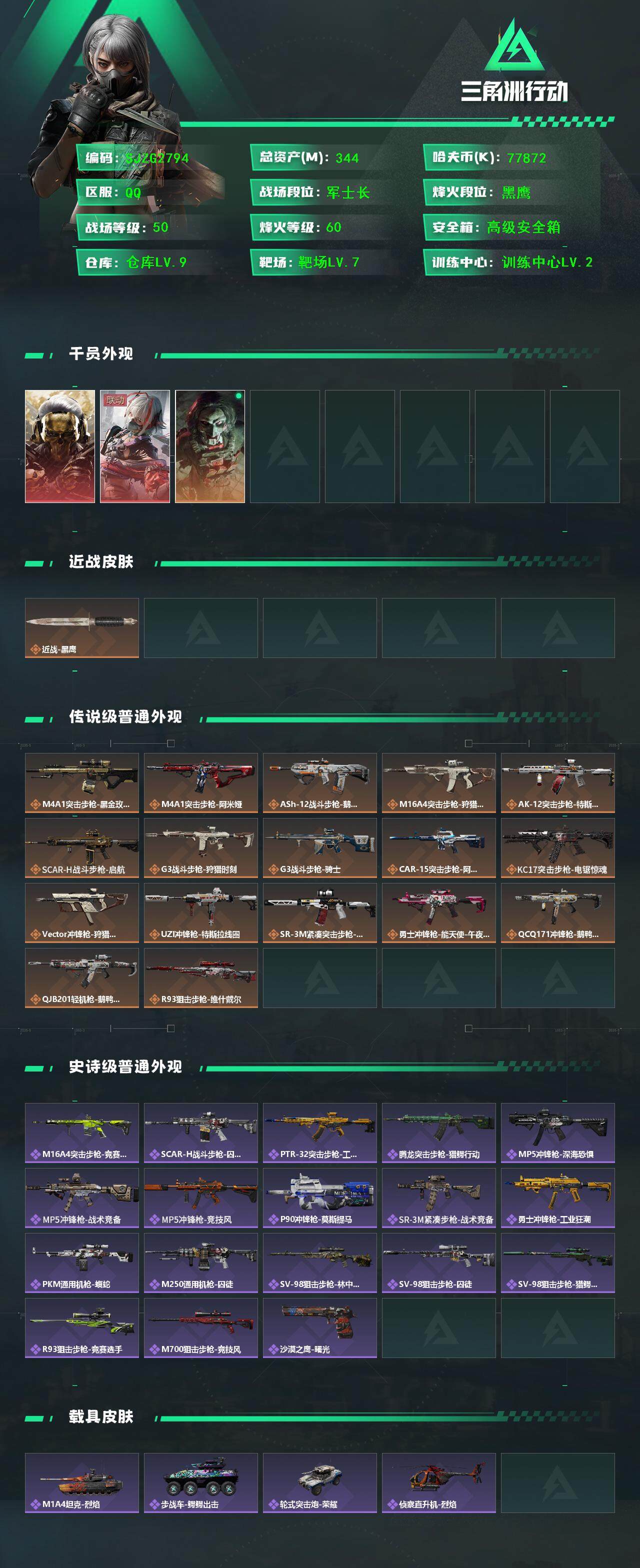 总资产(M):344M/哈夫币(K):77872K/哈夫币(K):77872K/传说枪皮数:18/全