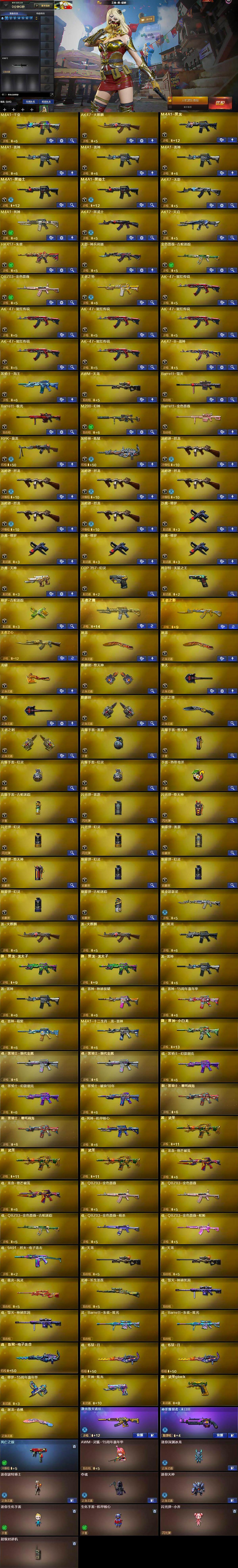 【热门武器】:QBZ03-金色蔷薇,HK417-朱雀,M200-幻神,金色蔷薇-古蛇迷踪,修罗-古蛇迷踪,死亡之眼,M4A1-黑骑士*2,汤姆逊-烈龙*6,RPK-盘龙,加特林-炼狱,COP 357-幻灵,沙鹰-修罗*4