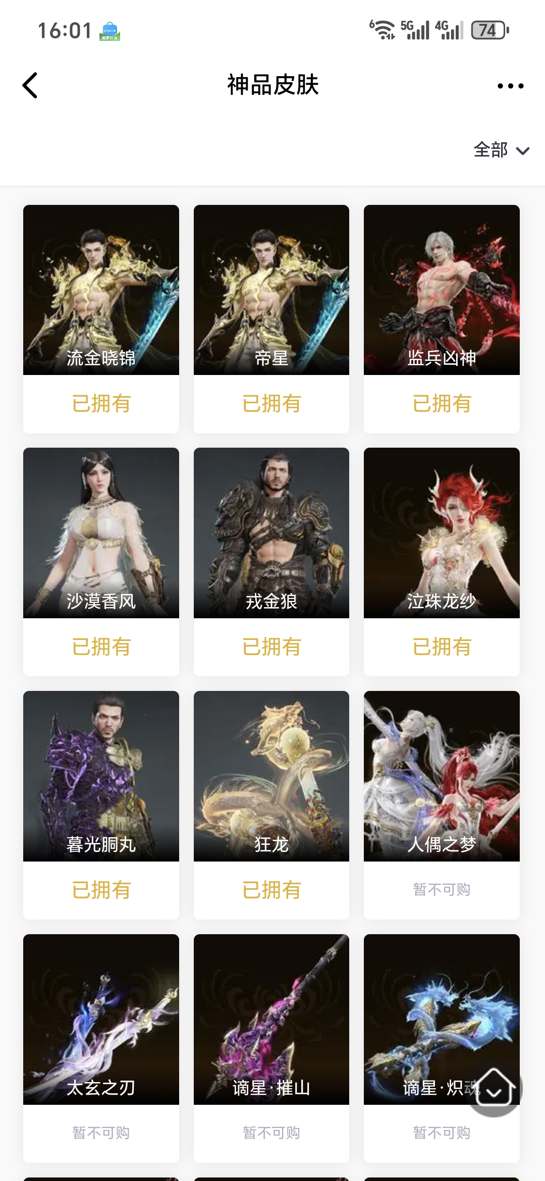 【极品皮肤】秋藏桂 天虹咏 暖冬茶馨 开辟鸿蒙·风雨谐 开辟鸿蒙·金戈止 封神录·申公豹 观山海·相柳 街头狂欢·涂鸦少女 日影花阴 蛰龙吟 追猎 神武 沙狼之怒 瑞火麟 碧水青天 西行劫·蜘蛛精 西行劫·悟净 新魔杰·斩魔天将 未济袍 枫狩 百战·破荆者