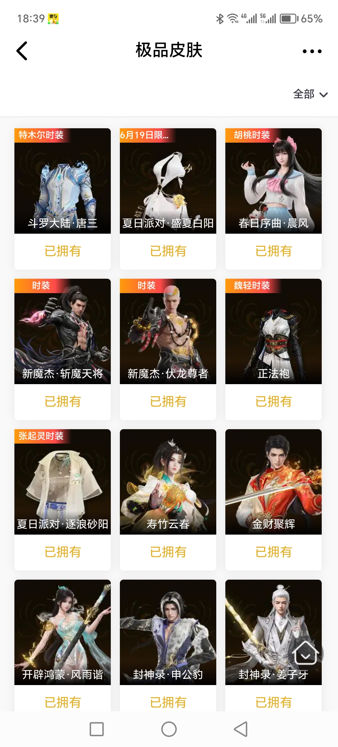 【极品皮肤】寿竹云春 金财聚辉 开辟鸿蒙·风雨谐 封神录·申公豹 封神录·姜子牙 浣烟纱 街头狂欢·涂鸦少女 街头狂欢·不败擂主 天工奥妙 斗罗大陆·唐三 夏日派对·盛夏白阳 长歌诗韵·胡旋女 蛰龙吟 九骊之君 云溪仙子 御宅罗梦 清雅少女 逆水寒·江海沧澜 麟鹿大铠 春桃笑 赤雾烟霞 碧水青天 斑斓衣