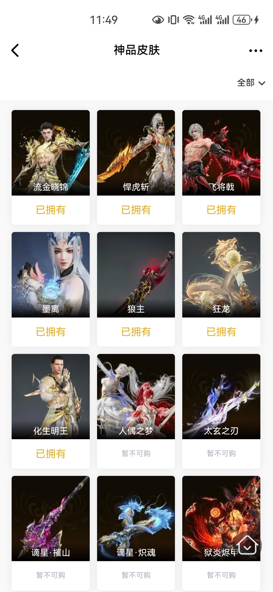 【神品皮肤】流金晓锦 悍虎斩 飞将戟 墨离 狼主 狂龙 化生明王