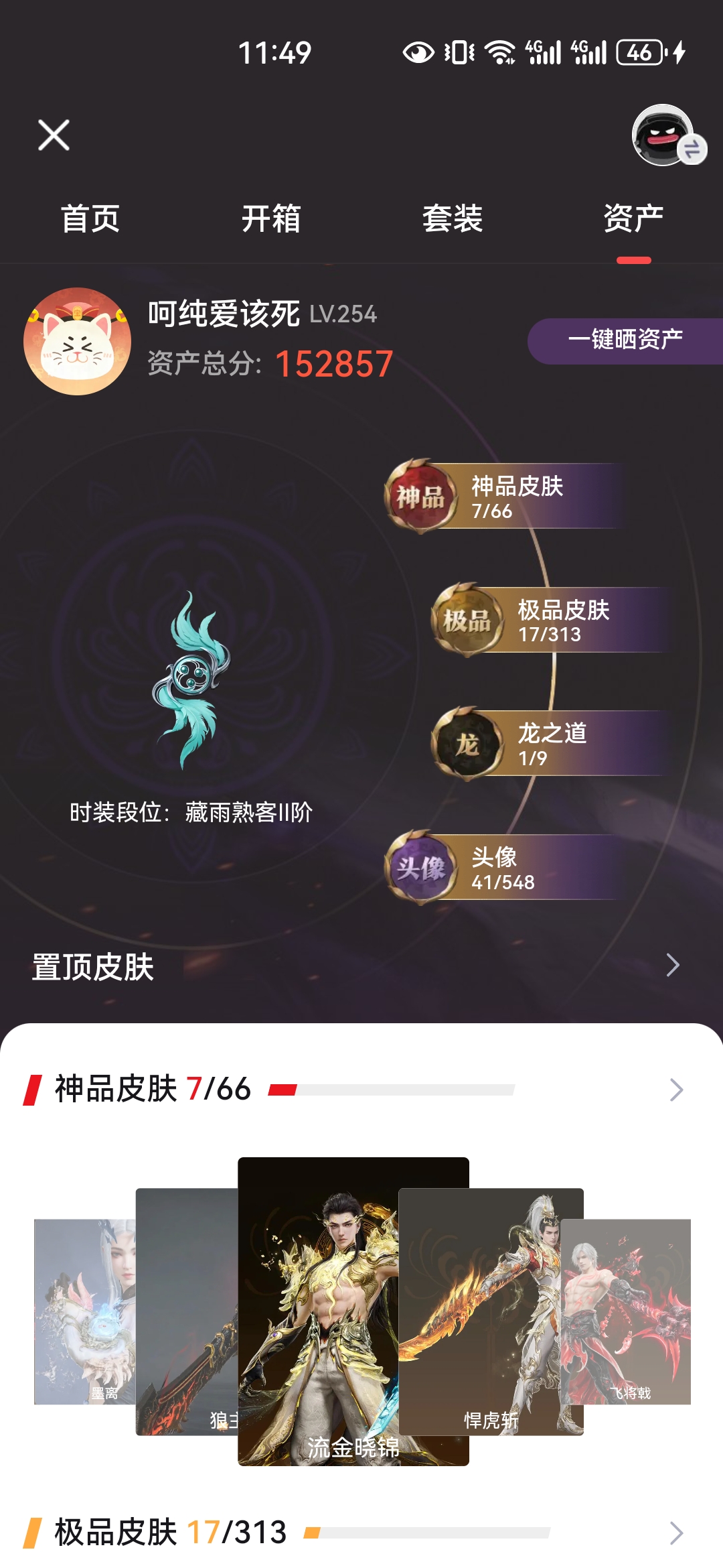 【极品皮肤】暖冬茶馨 寿竹云春 金财聚辉 封神录·申公豹 楚韵九歌·云中君 浣烟纱 斗罗大陆·唐三 追猎 阴阳师·赤影妖刀姬 麟鹿大铠 贵胄少女 碧水青天 八宝龙王 花之倾奇 龙门·飞天 不良人·李星云 龙之道·自知