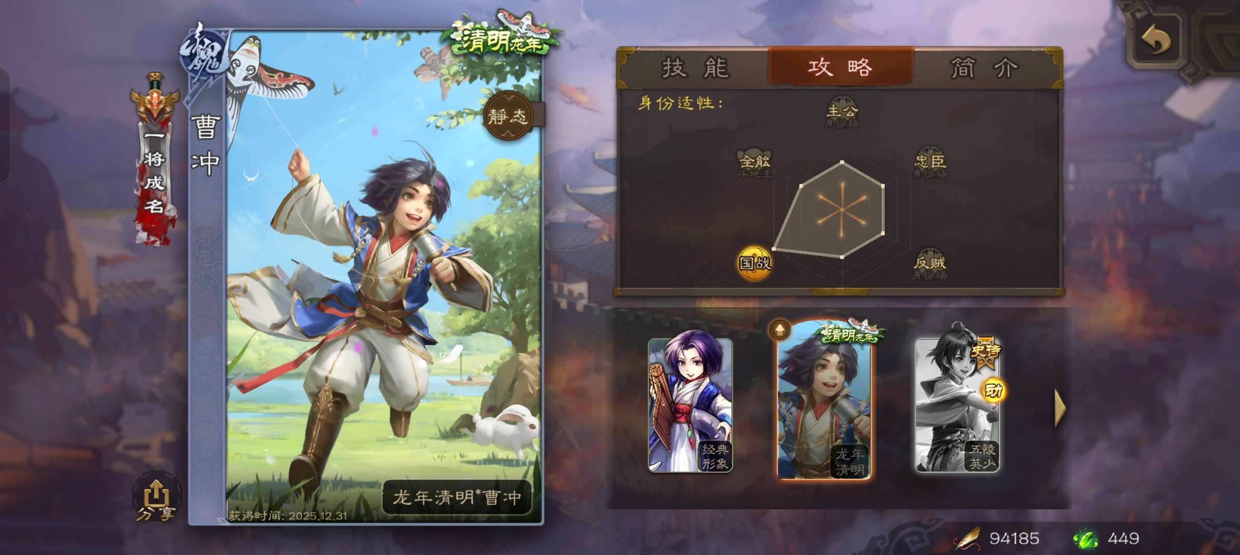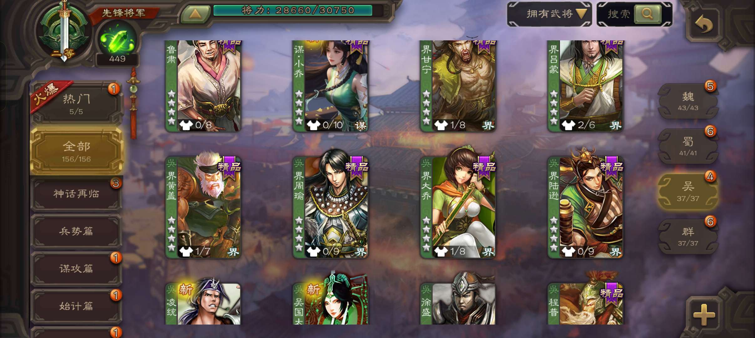 42宝珠9.4万羽毛,王元姬界钟会谯周杨修4史诗先锋。双天工孟达李遗,sp赵云鲁肃动曹冲156将
