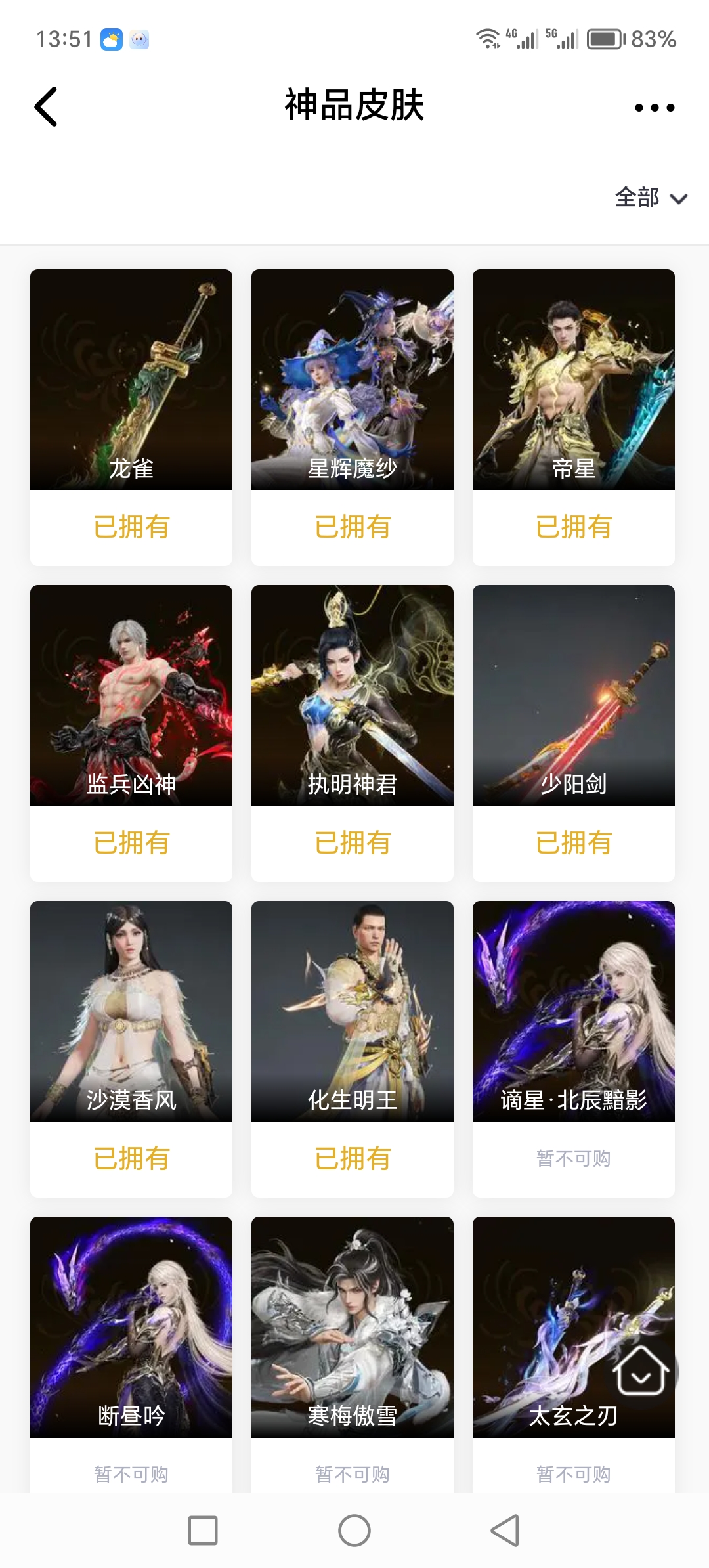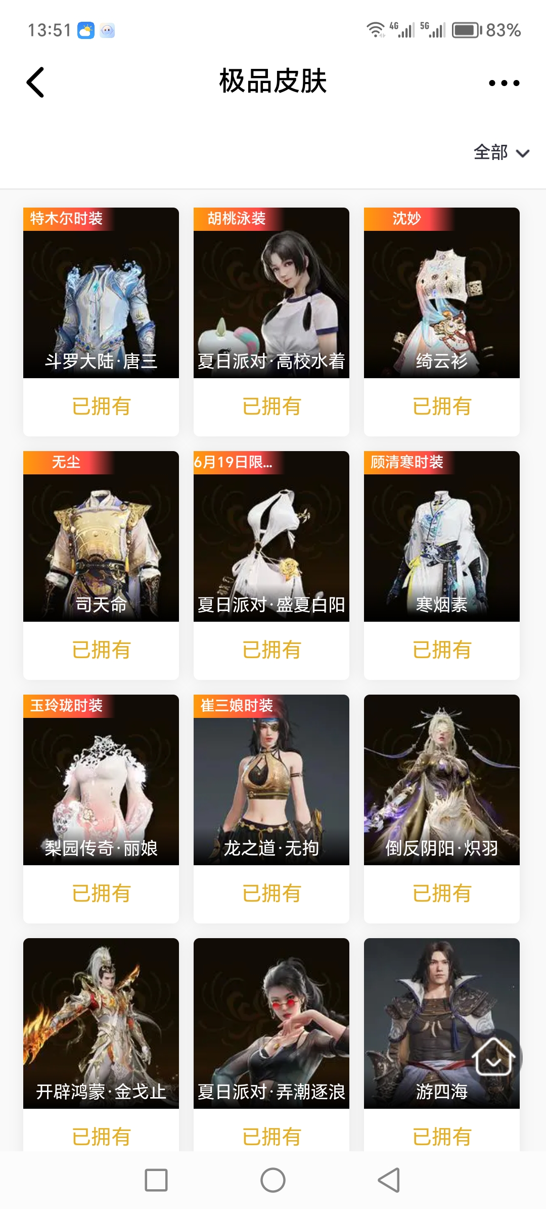 【极品皮肤】倒反阴阳·炽羽 开辟鸿蒙·金戈止 斗罗大陆·唐三 夏日派对·盛夏白阳 夏日派对·高校水着 司天命 绮云衫 夏日派对·弄潮逐浪 碧水青天 西行劫·悟空 八宝龙王 阴阳姬 游四海 金襦玉衫 瀚海苍鹰 西行劫·紫衣仙子 赤雾烟霞 弘毅袍 梨园传奇·丽娘 龙之道·无拘 寒烟素