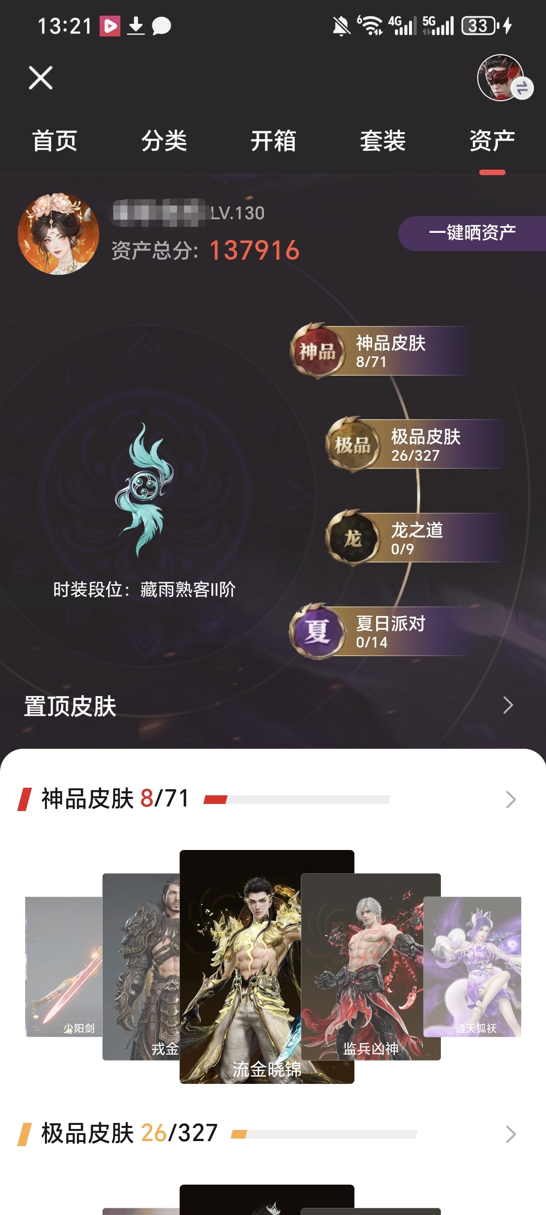 MYJ330【8红 26金 监兵凶神 通天狐袄】【游戏等级】130【大区】国服【神品皮肤】 流金晓锦 少阳剑 绝代风华 监兵凶神 戎金狼 嫖怒炼火 通天狐袄 狼主 【极品皮肤】 幽篁山鬼 观山海·秋神蓐收 寿竹云春 街头狂欢·不败擂主 斗罗大陆·唐三 决战平安京·朔夜 封神录·公豹 日影花阴 观山海·冬神玄冥 流火映真 封神录·姜子牙 观山海·腓腓 云溪仙子 絮云衣 沙狼之怒 麟鹿大铠 追猎 新倩女幽魂·瑶光 清雅少女 九阴圣女 御宅罗梦 神武 逆水寒·江海沧澜 翰海苍鹰 赤丹朱湛 耀世魂花