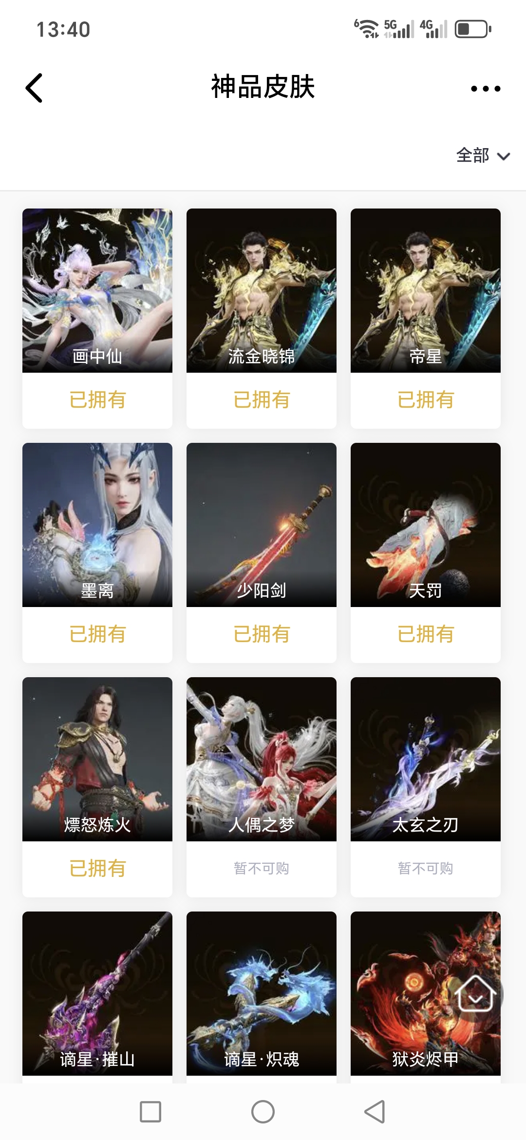 【神品皮肤】画中仙 流金晓锦 帝星 墨离 少阳剑 天罚 熛怒炼火