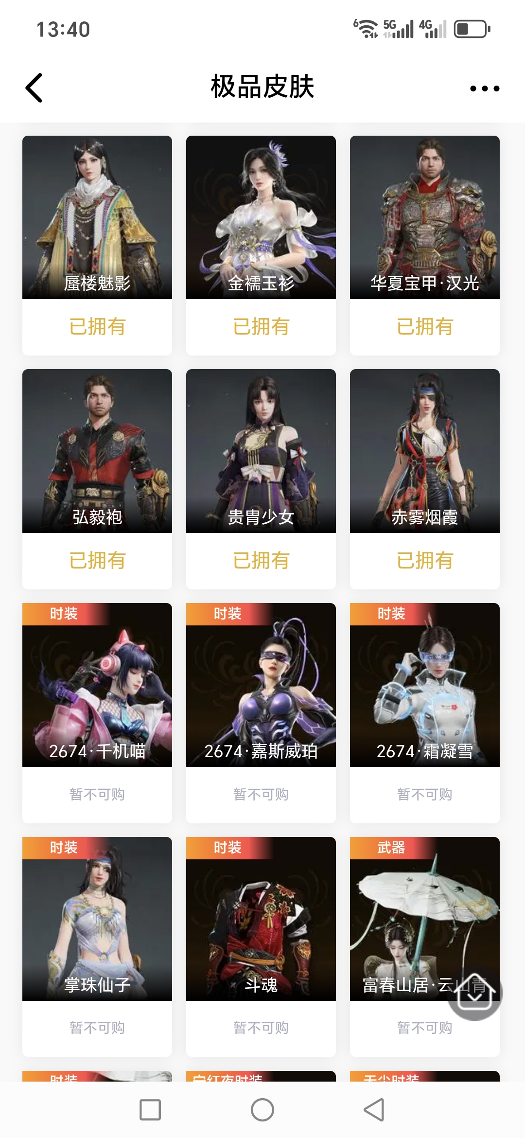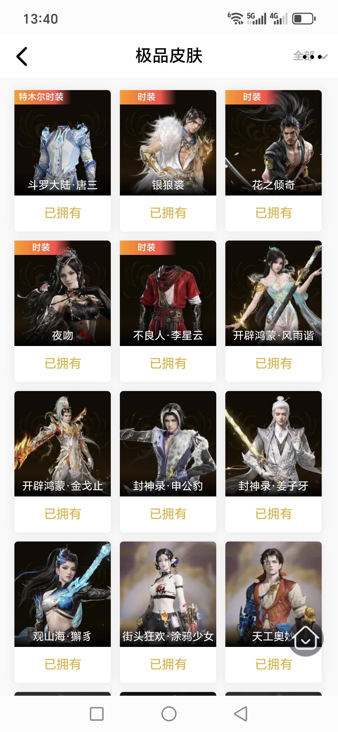 【极品皮肤】开辟鸿蒙·风雨谐 开辟鸿蒙·金戈止 封神录·申公豹 封神录·姜子牙 观山海·獬豸 街头狂欢·涂鸦少女 天工奥妙 斗罗大陆·唐三 蜃楼魅影 金襦玉衫 华夏宝甲·汉光 弘毅袍 贵胄少女 赤雾烟霞 银狼裘 花之倾奇 夜吻 不良人·李星云