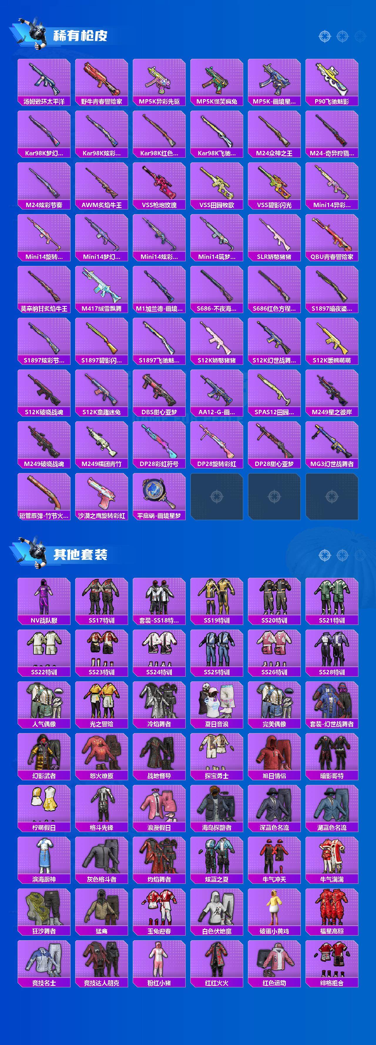 【HPZG103】134套装/枪械3/装备217/载具2/战备109/王牌印记6/热力值55322/六级SCAR-L-青春物语/六级SKS-碧影闪光/五级DP-28-豹影疾电/粉装-梦幻火箭/奇异狩猎者/军刀雅典娜/套装-龟仙人/套装-暗影哥特/套装-粉红小猪/套装-红红火火/宝贝奶油派/梦幻火箭/炙焰红王/零号机款机体服/初号机款机体服/碧影闪光/复仇流浪者/霁雪冰心/粉装-幻彩电音/玛莎拉蒂Quattroporte(夜幕蓝)/星梦玉骢/SCAR-L-青春物语/SKS-碧影闪光/DP-28-豹