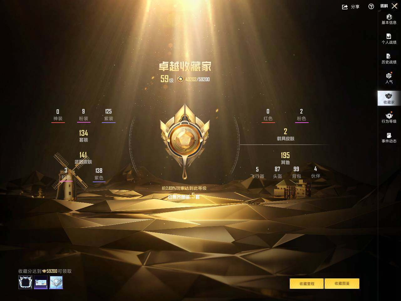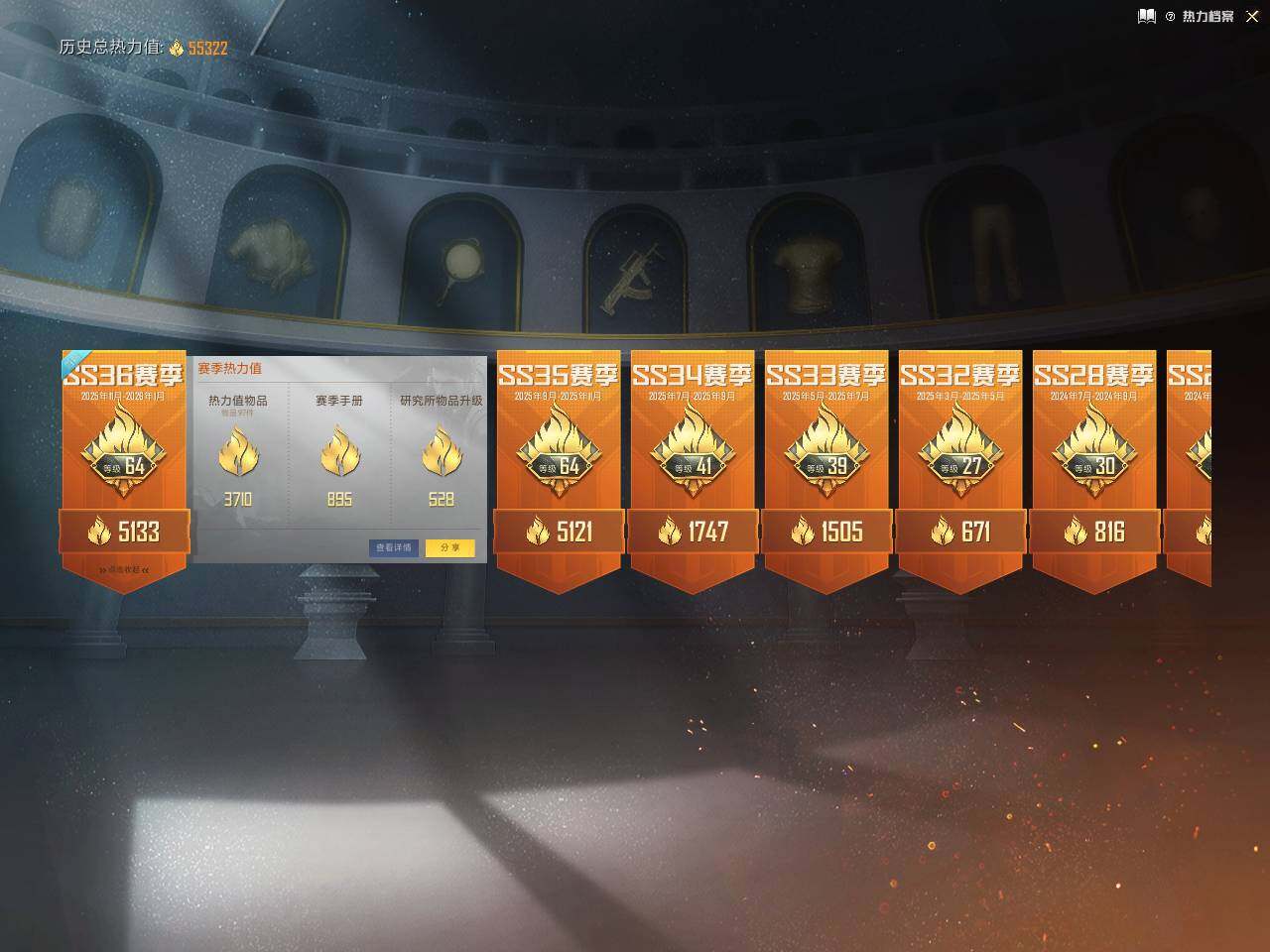 134套装/枪械3/装备217/载具2/战备109/王牌印记6/热力值55322/
