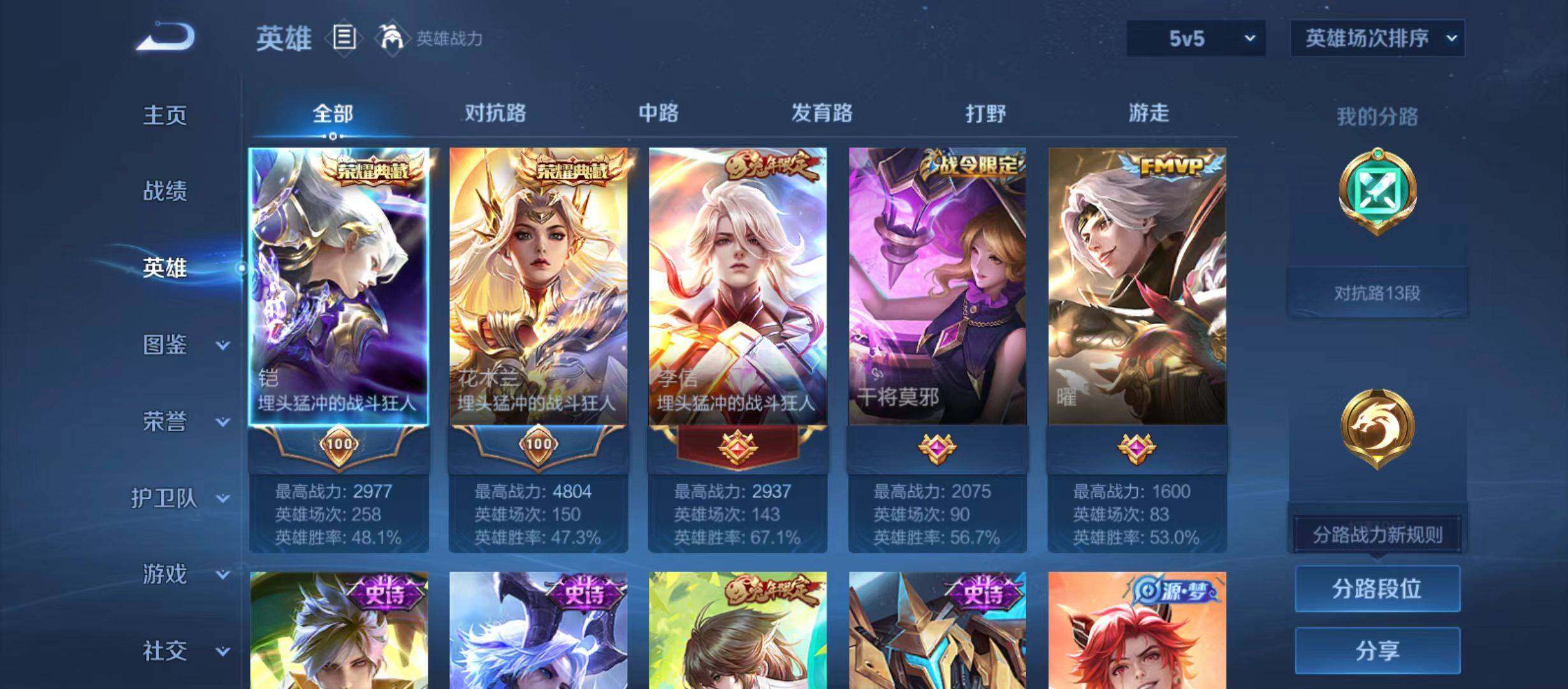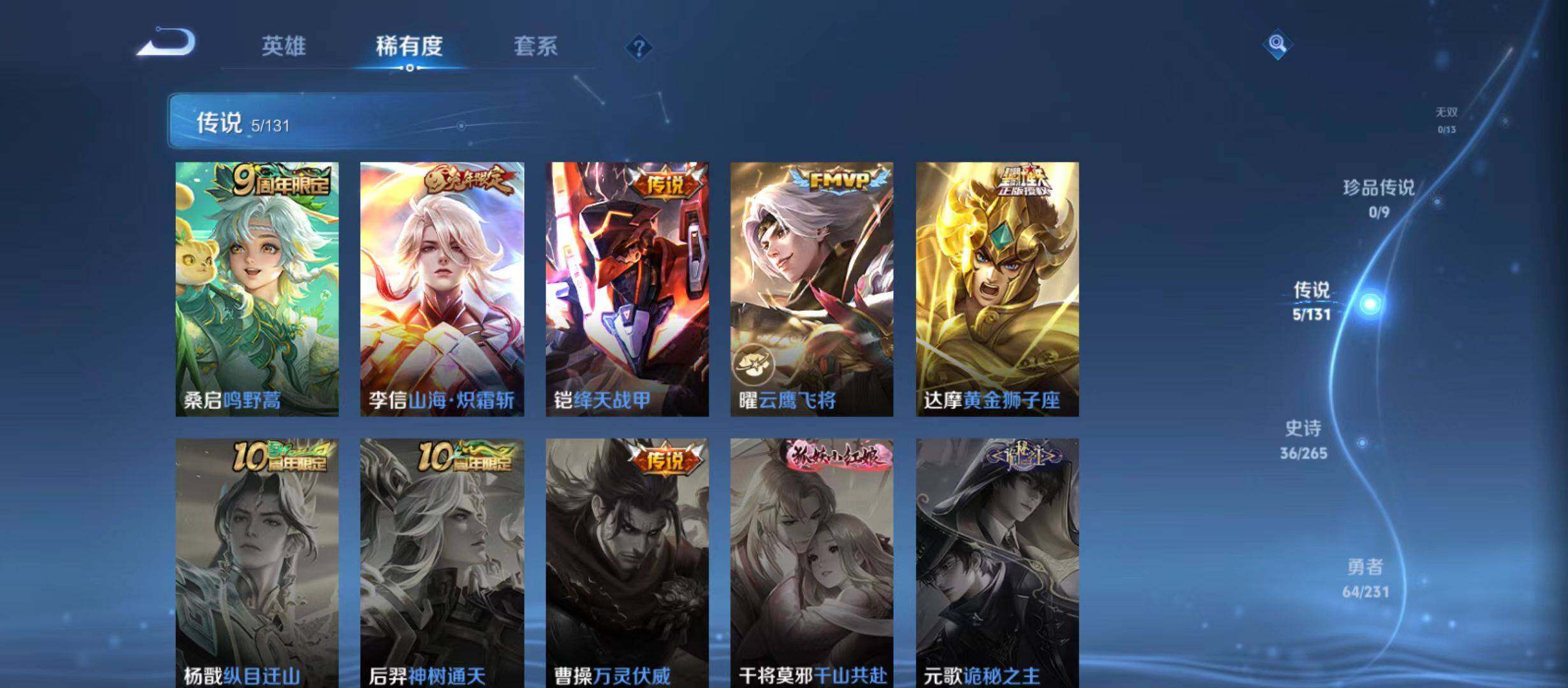 7/137皮肤2典藏5传说 九霄神辉 银白咏叹调 至尊宝 山海炽霜斩 绛天战甲 云鹰飞将 黄金狮子座 鸣野蒿 山海玄木吟 蔷薇恋人