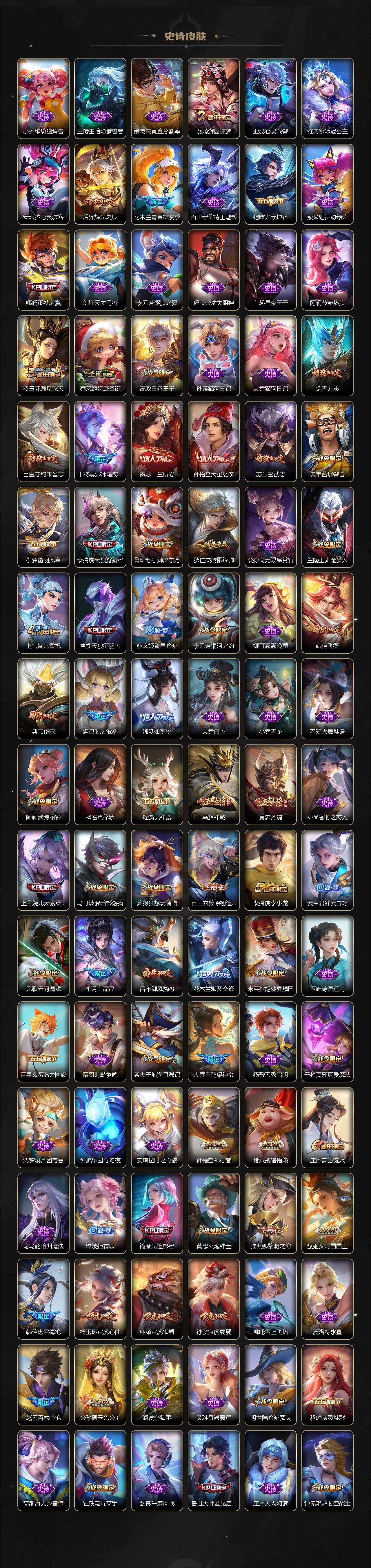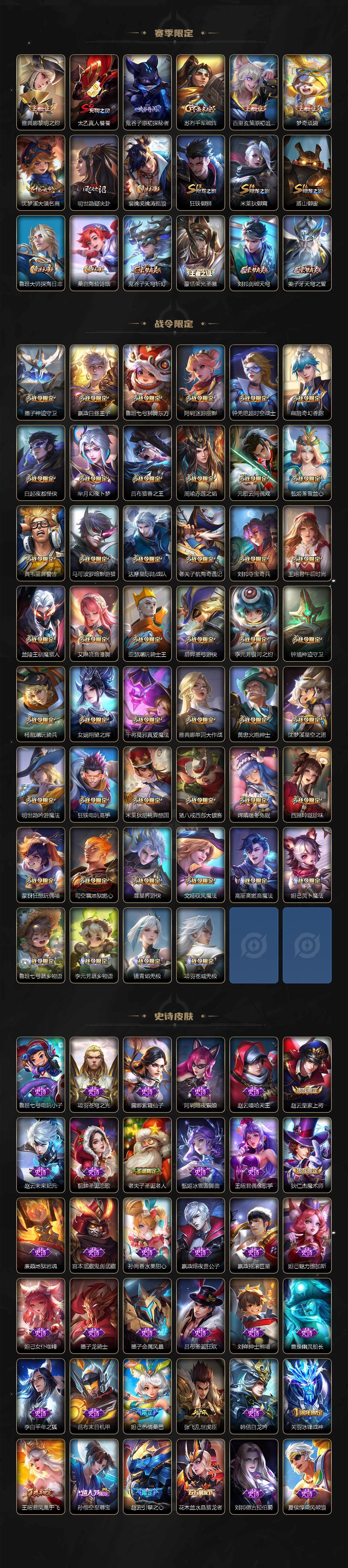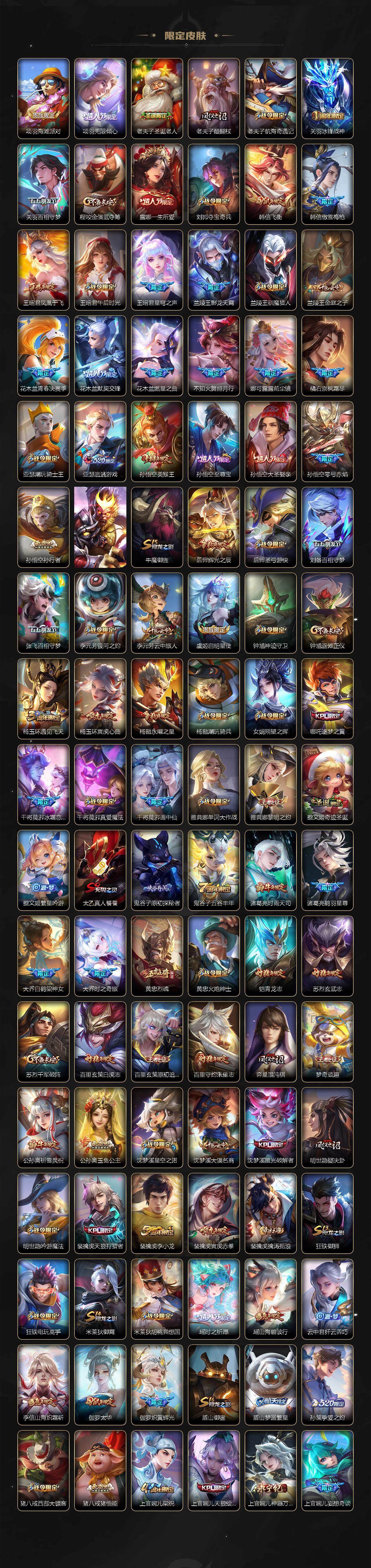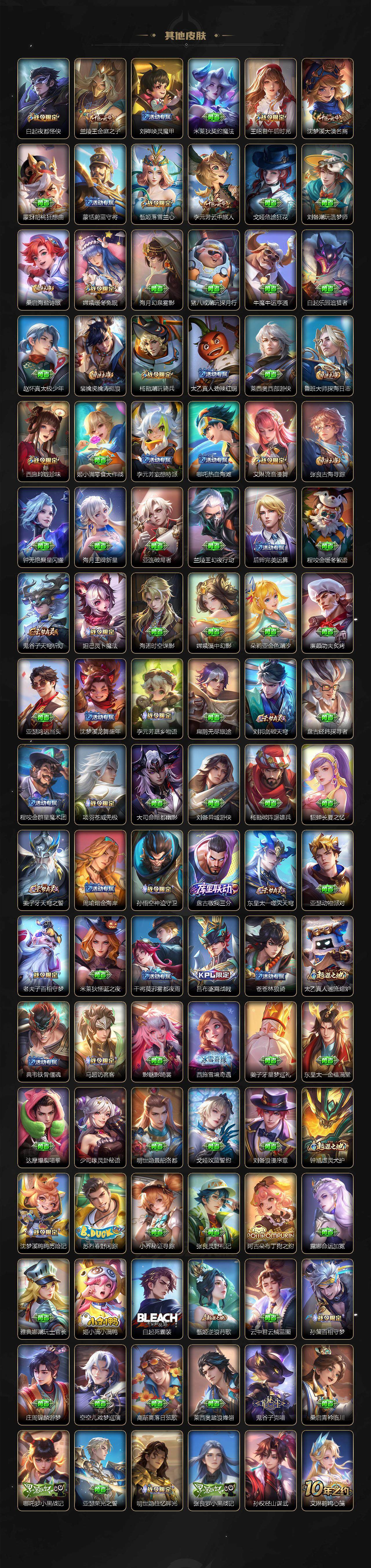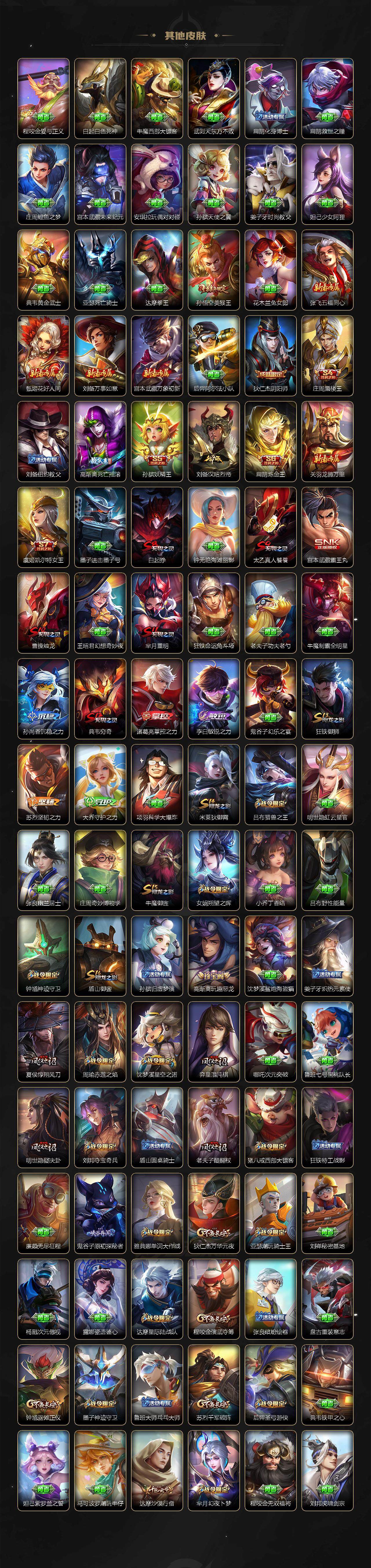 【英雄全皮】:廉颇全皮,刘禅全皮,高渐离全皮,阿轲全皮,扁鹊全皮,白起全皮,元歌全皮,典韦全皮,宫本武藏全皮,李白全皮,达摩全皮,司马懿全皮,老夫子全皮,姜子牙全皮,刘邦全皮,孙权全皮,王昭君全皮,艾琳全皮,朵莉亚全皮,娜可露露全皮,橘