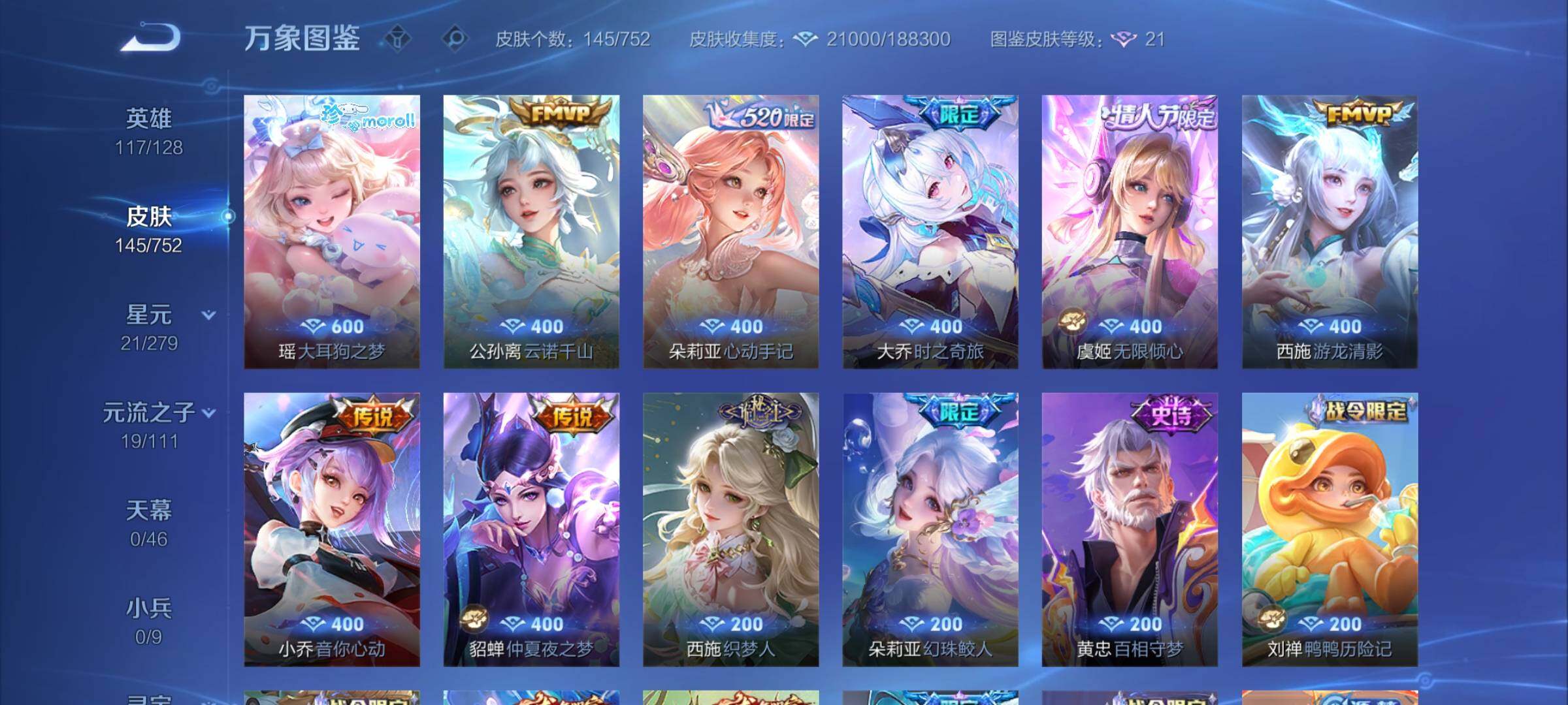 可换绑【瑶珍品 朵莉亚心动手记 龙年安琪拉大乔 多传说限定质量号】 7按键,1星传说,9王者印记,五级铭文150,可二次KK7402,安卓Q-V7-145皮肤-1珍品传说-7传说-49史诗【英雄全皮】:朵莉亚全皮【珍品传说】:瑶大耳狗之梦【星元皮肤】:貂蝉金色仲夏夜【传说皮肤】:公孙离云诺千山,朵莉亚心动手记,大乔时之奇旅,虞姬无限倾心,西施游龙清影,小乔音你心动