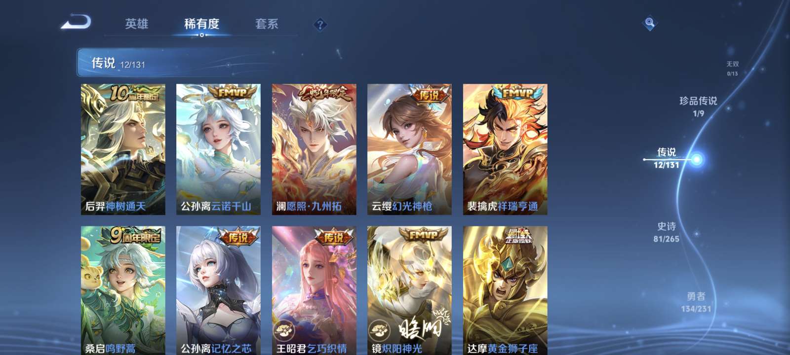 王者荣耀射手号 现巅峰2052两典藏一珍品皮肤碎片两百多荣耀水晶275幸运值