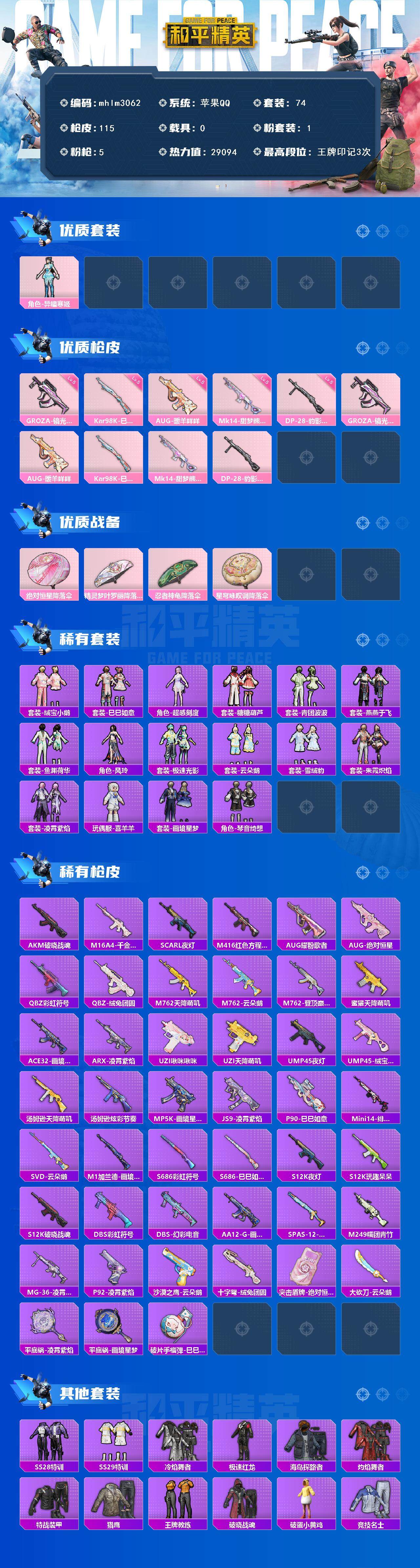 【mhlm3062】苹果 手Q-1粉装-5特效枪-0载具-1粉色飞行器-29094热力值-3王牌印记-74套装-115枪皮