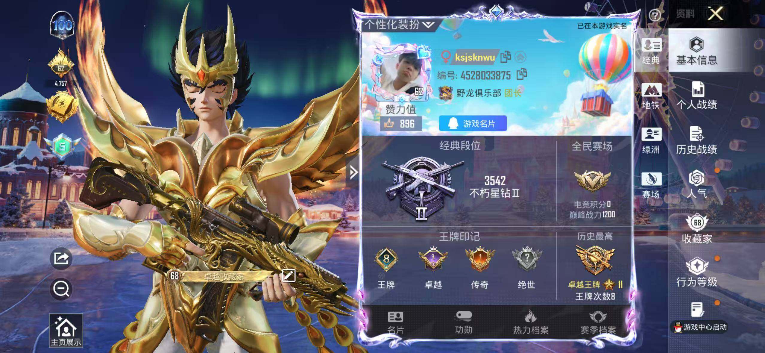 149套装/枪械11/装备274/战备155/王牌印记8/热力值69236/六级M16A4-垂柳戏鸭/七级M416-五爪金龙/五级GROZA-镜光银凌/五级AUG-暖羊咩咩/一级蜜獾-异瞳寒姬/七级Vector-绯穹魔姬/六级AKS-74U-星穹咏叹调/二级Kar98K-创世·救赎/五级Kar98K-巳巳如意/四级M249-绝对恒星/五级DP-28-豹影疾电/套装-龟仙人/星之彼岸/射星猎手/莲