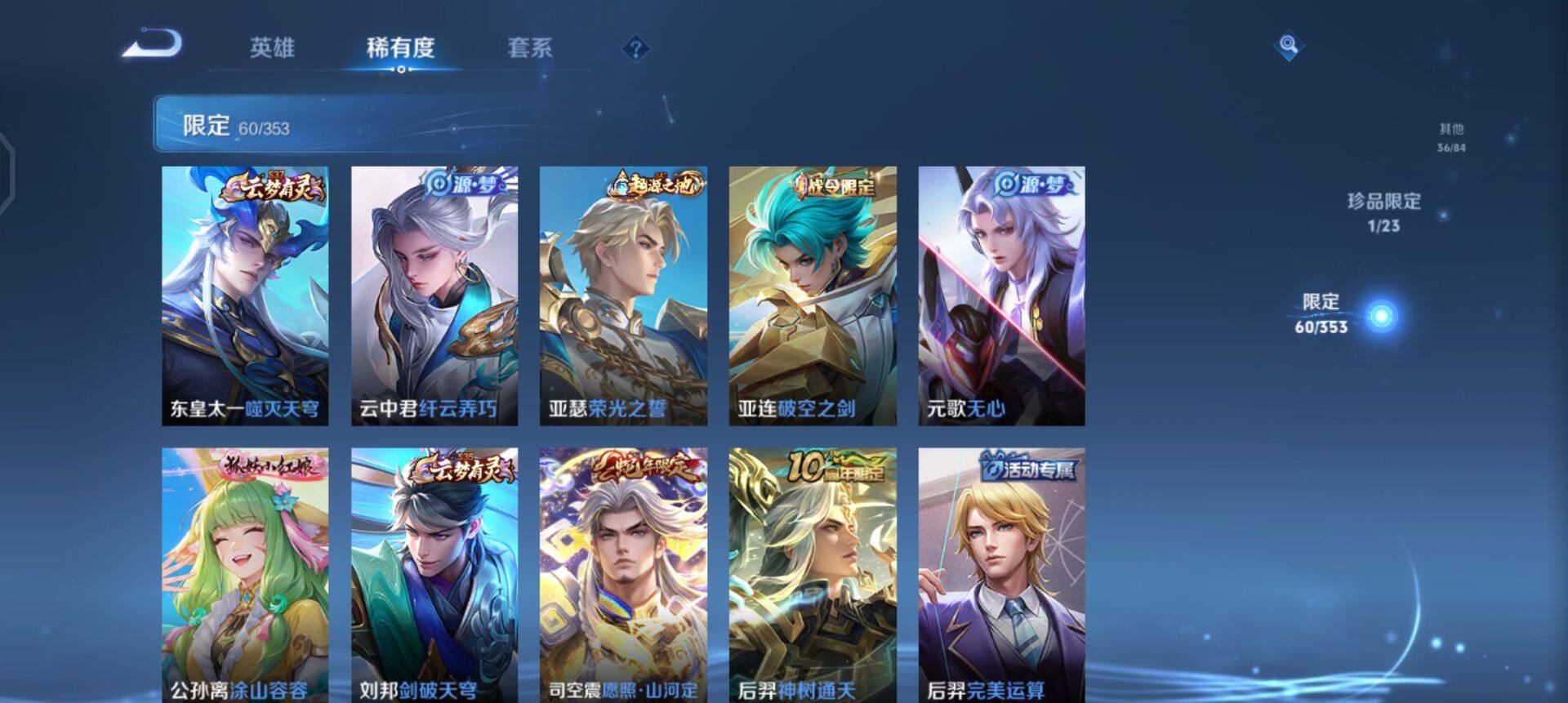 【传说皮肤】:后羿神树通天,司空震愿照山河定,澜愿照九州拓,云缨幻光神枪,桑启鸣野蒿,宫本武藏地狱之眼