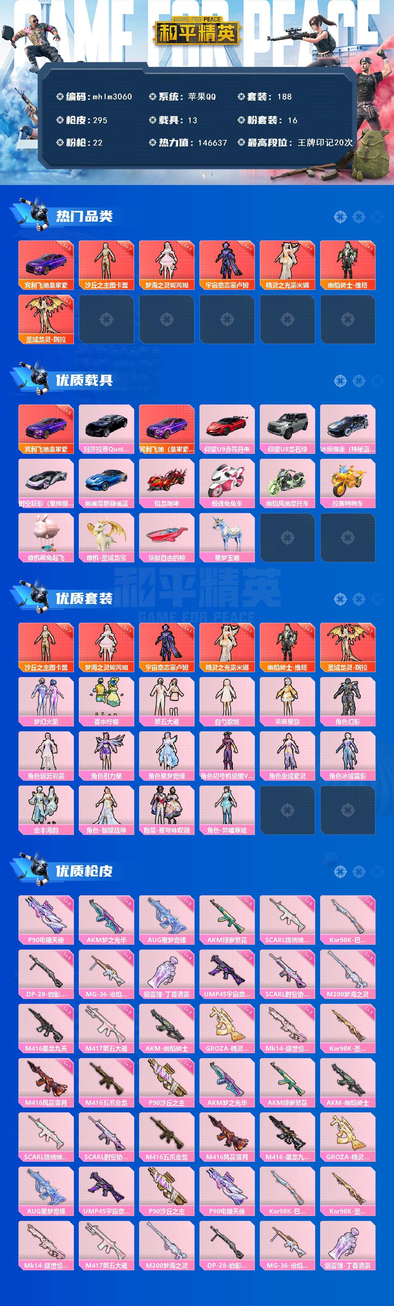 【mhlm3060】苹果 手Q-6神装-16粉装-22特效枪-13载具-15粉色飞行器-146637热力值-20王牌印记-188套装-295枪皮