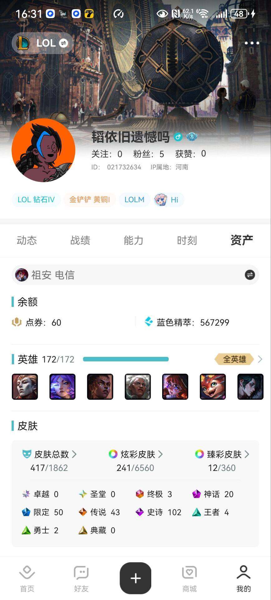 可二次【特价出售/店主推荐】未定级段位-172英雄-417皮肤-241炫彩-3终极-20神话-50限定-43传说-102史诗