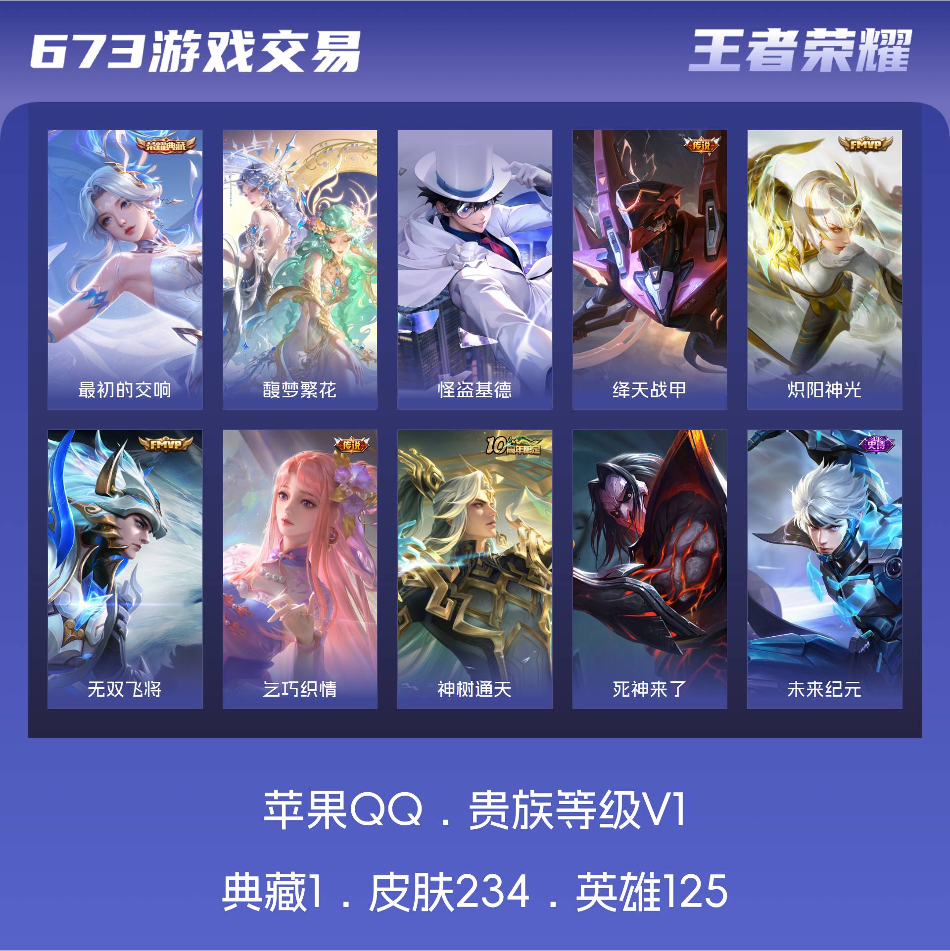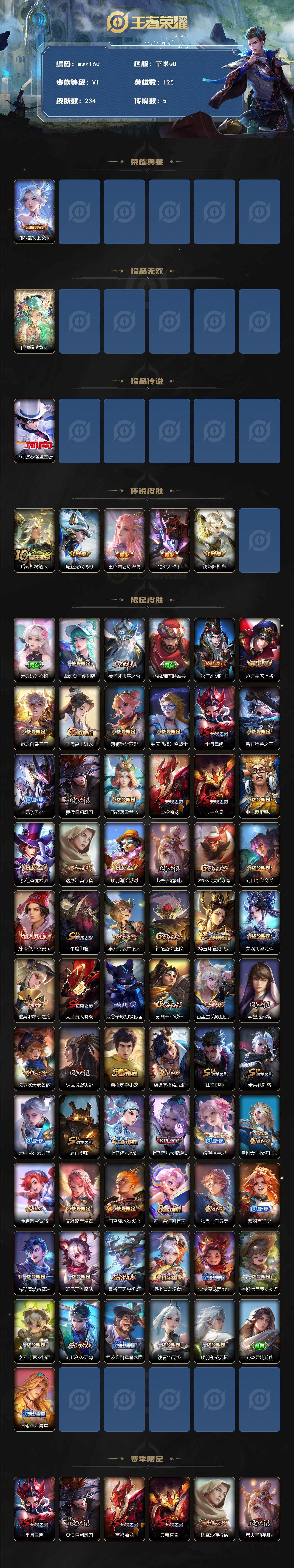 皮肤234 英雄125 无双王者 荣耀典藏1 珍品无双1 珍品传说1 传说5 其他皮肤101-苹果Q-V1-最强王者段位-125英雄-234皮肤-1典藏皮肤-1珍品无双-1