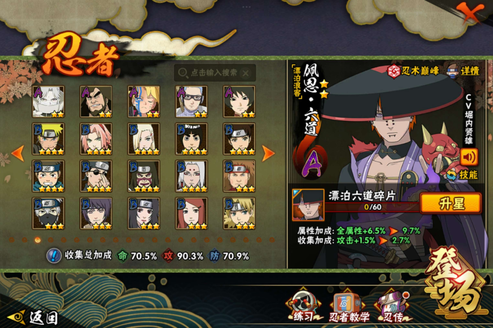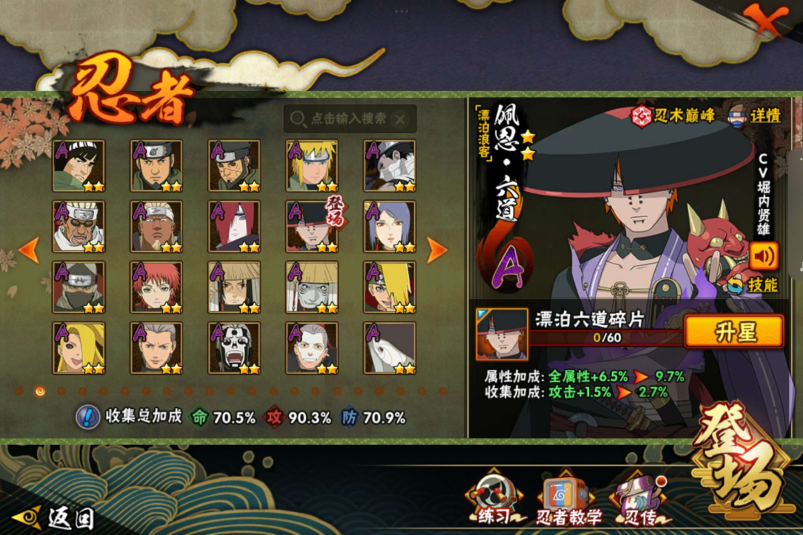 【S级忍者】宇智波带土「忍界大战」(3星),宇智波斑「秽土转生·解」(3星),宇智波佐助「永恒万花筒」(3星),自来也「舞之豪杰」(3星),宇智波鼬「秽土转生」(3
