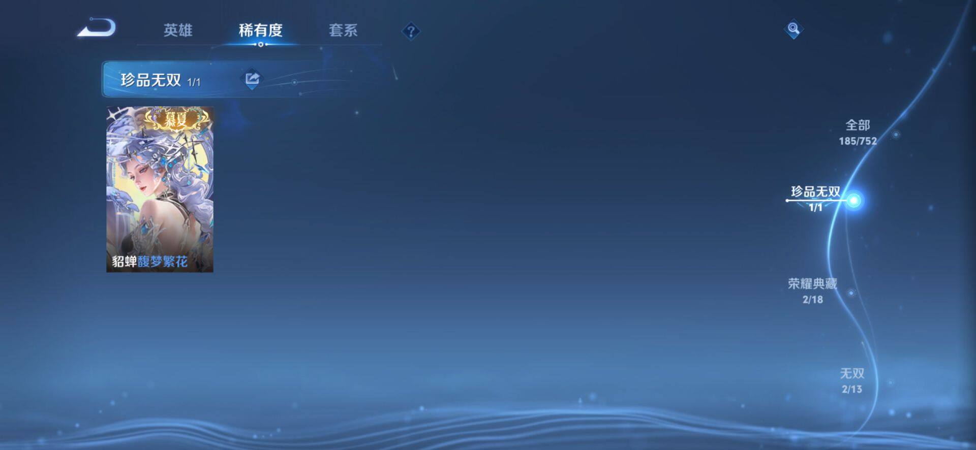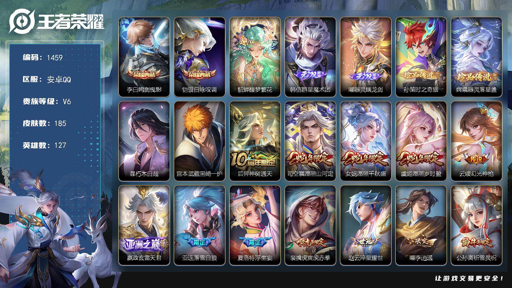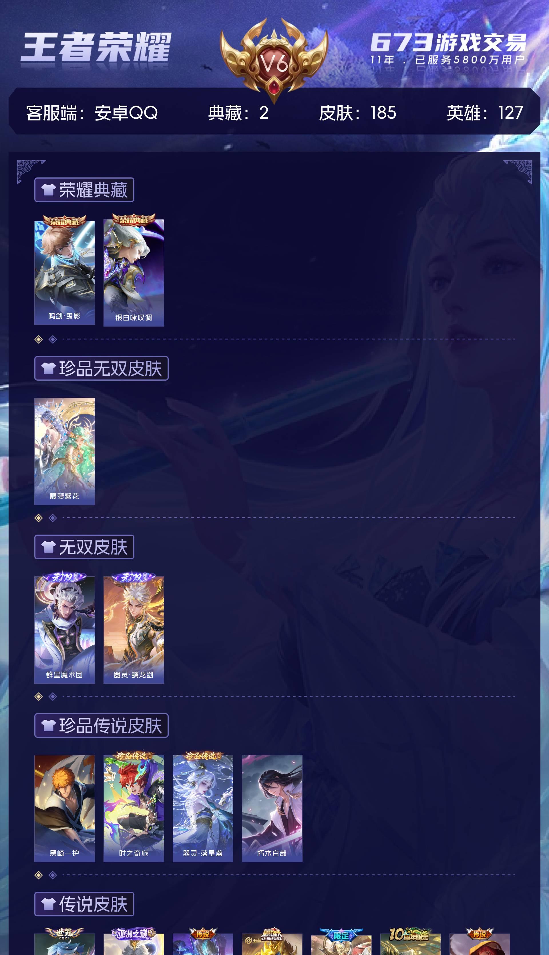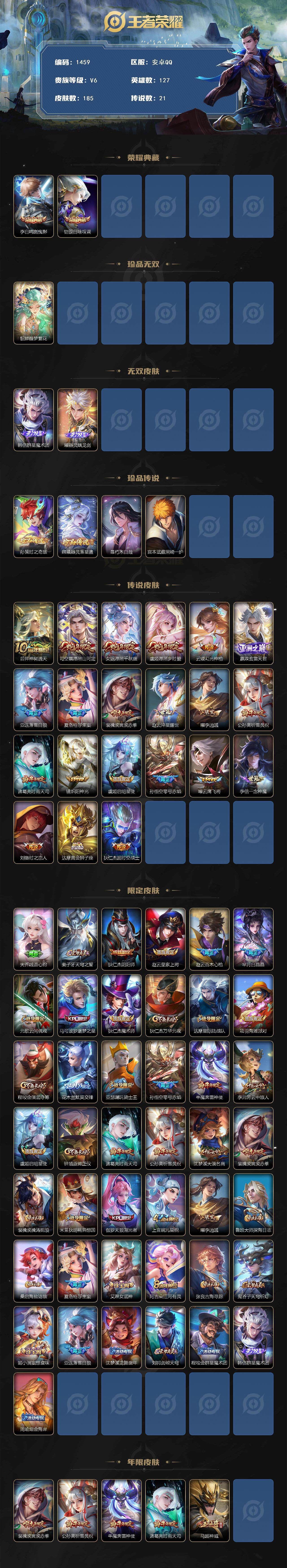 皮肤185 英雄127 至圣王者 荣耀典藏2 珍品无双1 无双皮肤2 珍品传说4 传说21 其他皮肤72-【貂蝉馥梦繁花 韩信 曜无双4珍品21传说 极品号】安卓Q-V6-最强王者段位