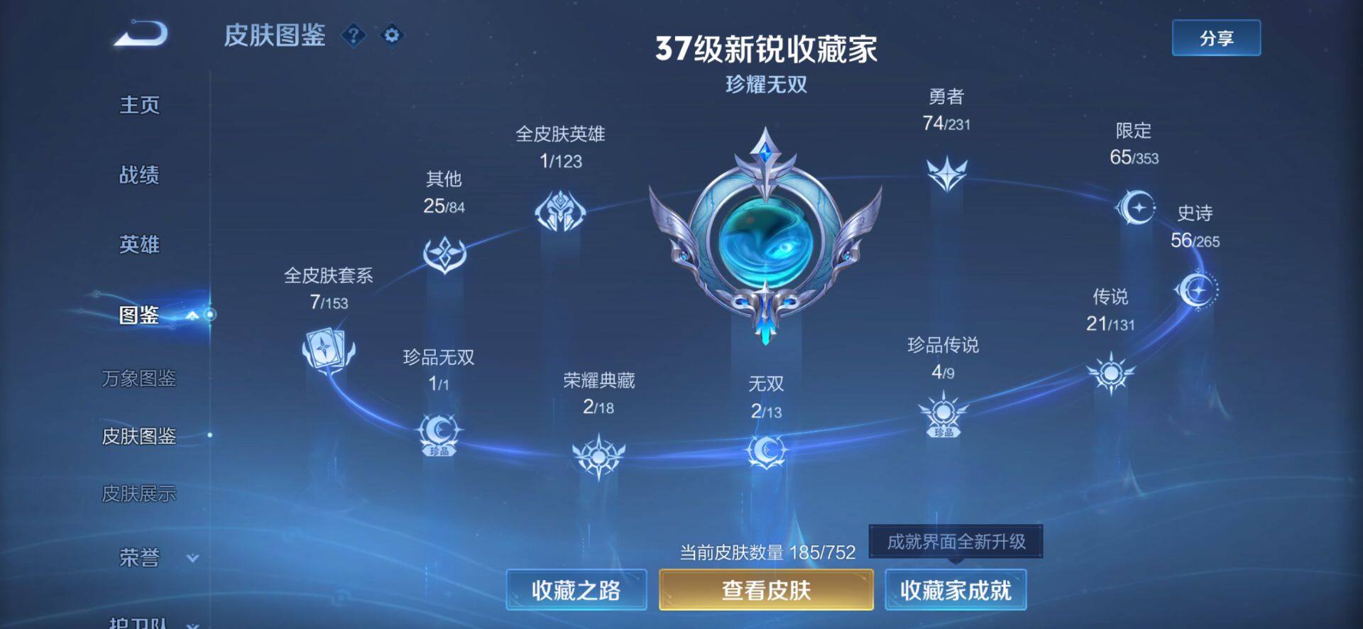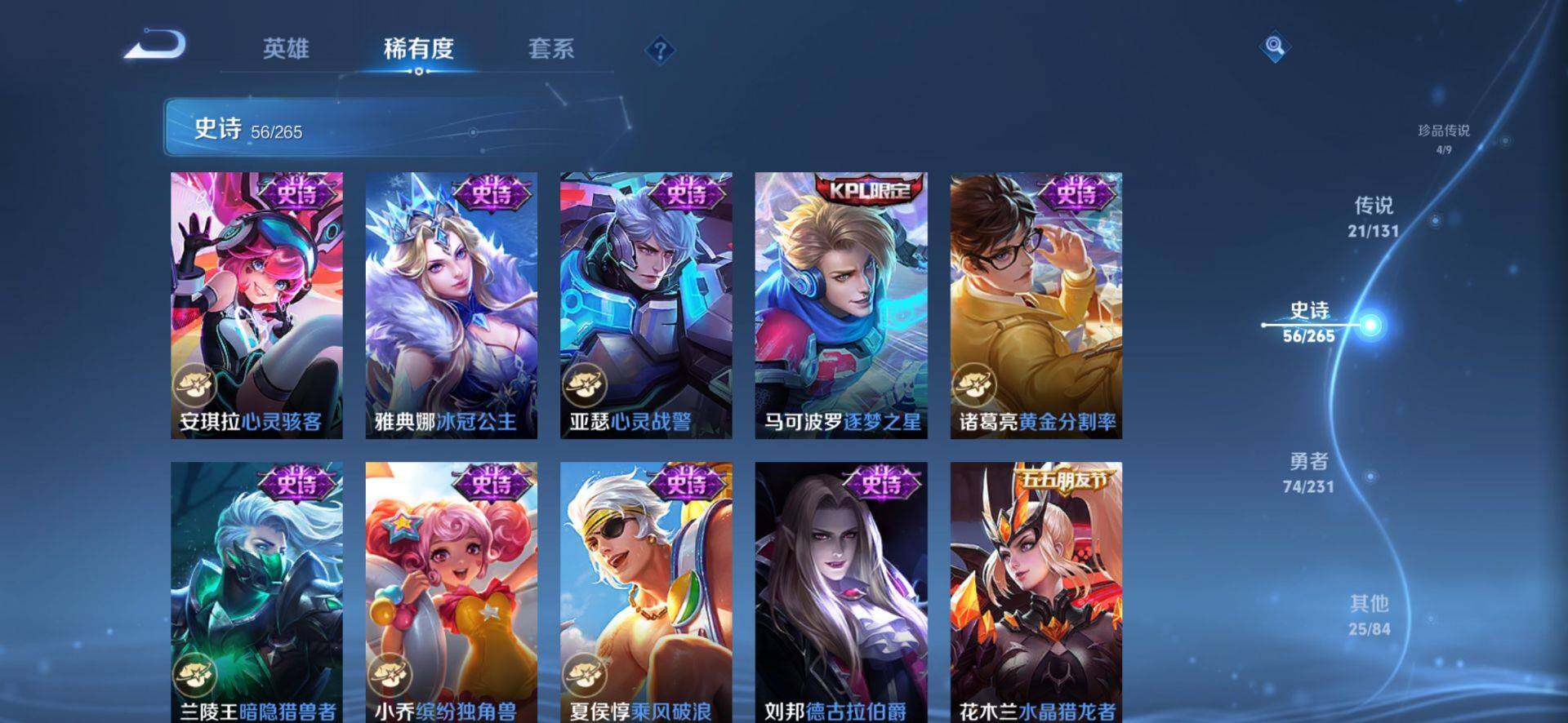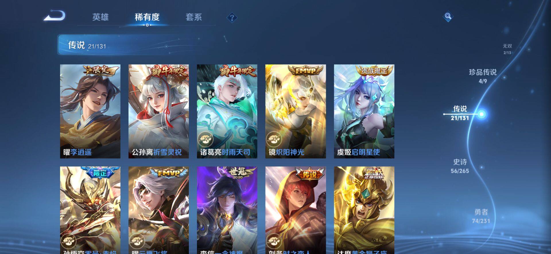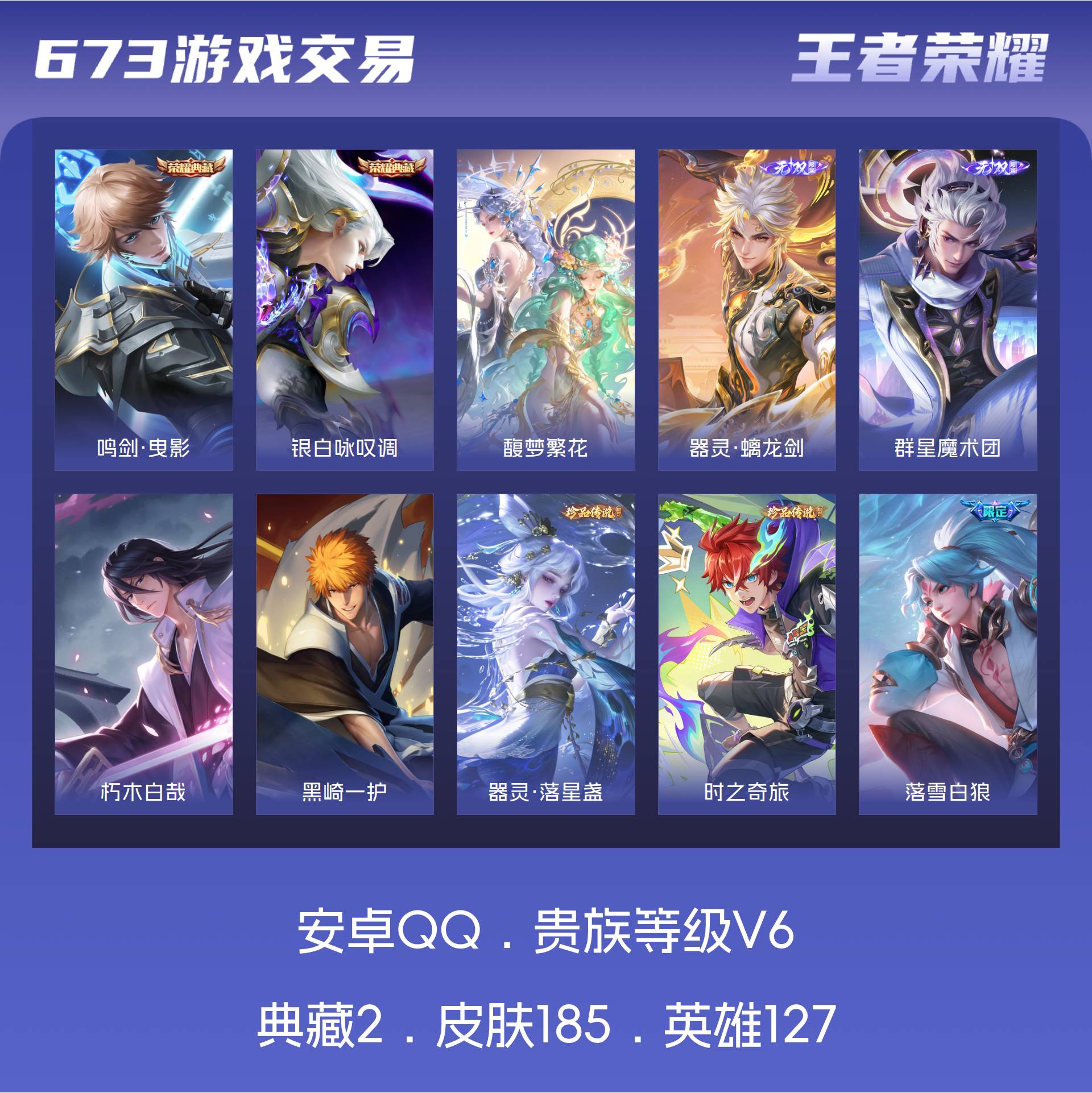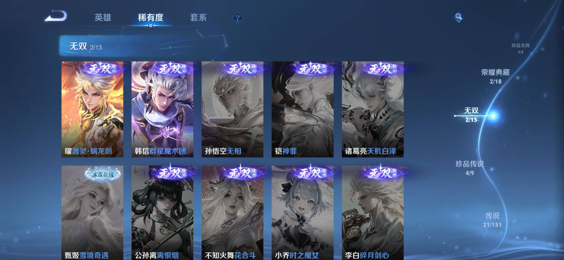 皮肤185 英雄127 至圣王者 荣耀典藏2 珍品无双1 无双皮肤2 珍品传说4 传说21 其他皮肤72-【貂蝉馥梦繁花 韩信 曜无双4珍品21传说 极品号】安卓Q-V6-最强王者段位