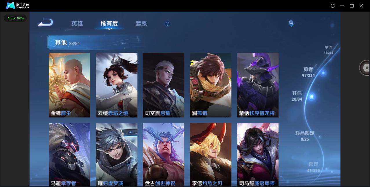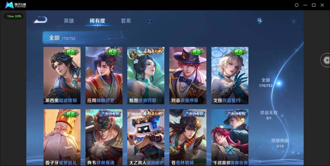 贵族等级: V6 英雄数: 126 皮肤数: 170 传说皮: 乘龙·问璇玑,乘龙·铭钟鼎 限定皮: 李小龙,神威,高山流水,匿光追影者,五谷丰年,鸣野蒿