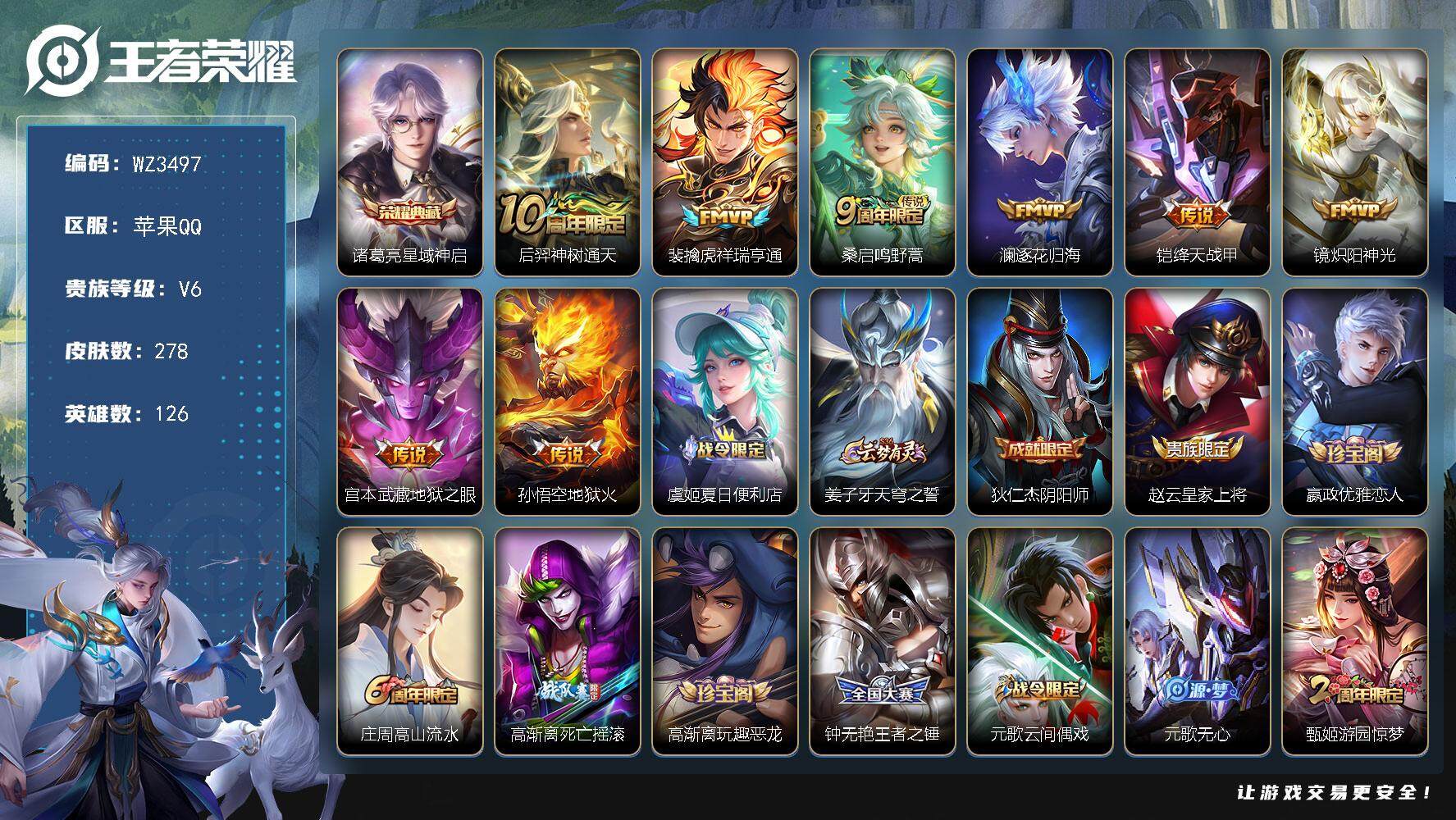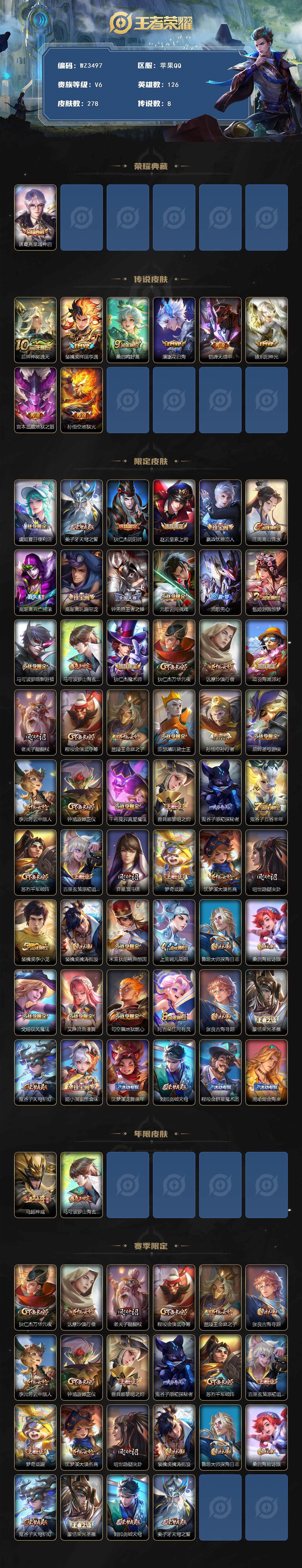 【WZ3497】贵族6/皮肤278/典藏1/传说8/史诗74/英雄126/孙权全皮/影全皮/诸葛亮-星域神启/后羿神树通天/裴擒虎-祥瑞亨通/桑启-鸣野蒿/澜-逐花归海/铠-绛天战甲/镜-炽阳神光/宫本武藏-地狱之眼/孙悟空-地狱火/虞姬-夏日便利店/姜子牙-天穹之誓/狄仁杰-阴阳师/赵云-皇家上将/嬴政-优雅恋人/庄周-高山流水/高渐离-死亡摇滚/高渐离-玩趣恶龙/钟无艳-王者之锤/元歌-云间偶戏/元歌-无心/甄姬-游园惊梦/马可波罗-暗影游猎/马可波罗-山海·玄木吟/狄仁杰-魔术师/狄仁杰-