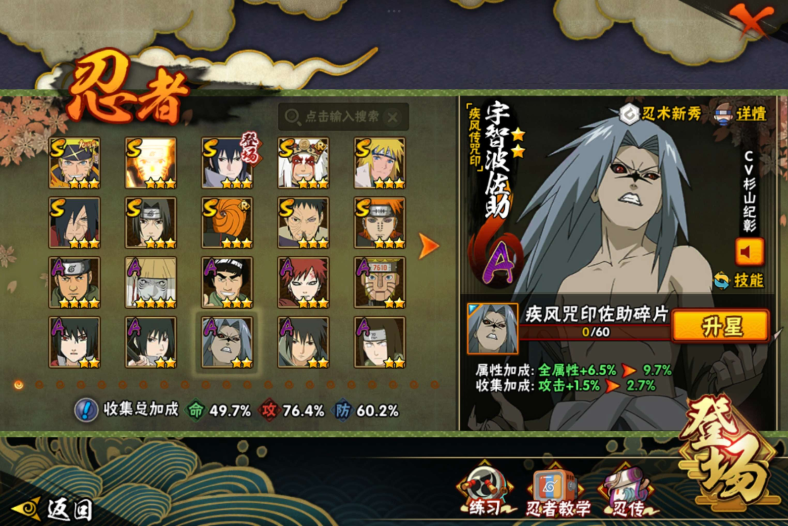 【S级忍者】宇智波带土「忍界大战」(3星),宇智波斑「秽土转生·解」(3星),宇智波佐助「永恒万花筒」(3星),漩涡鸣人「九喇嘛连结」(3星),自来也「舞之豪杰」(3星),宇智波鼬「须佐能乎」(3星),佩恩「天道」(3星),波风水门(3星),