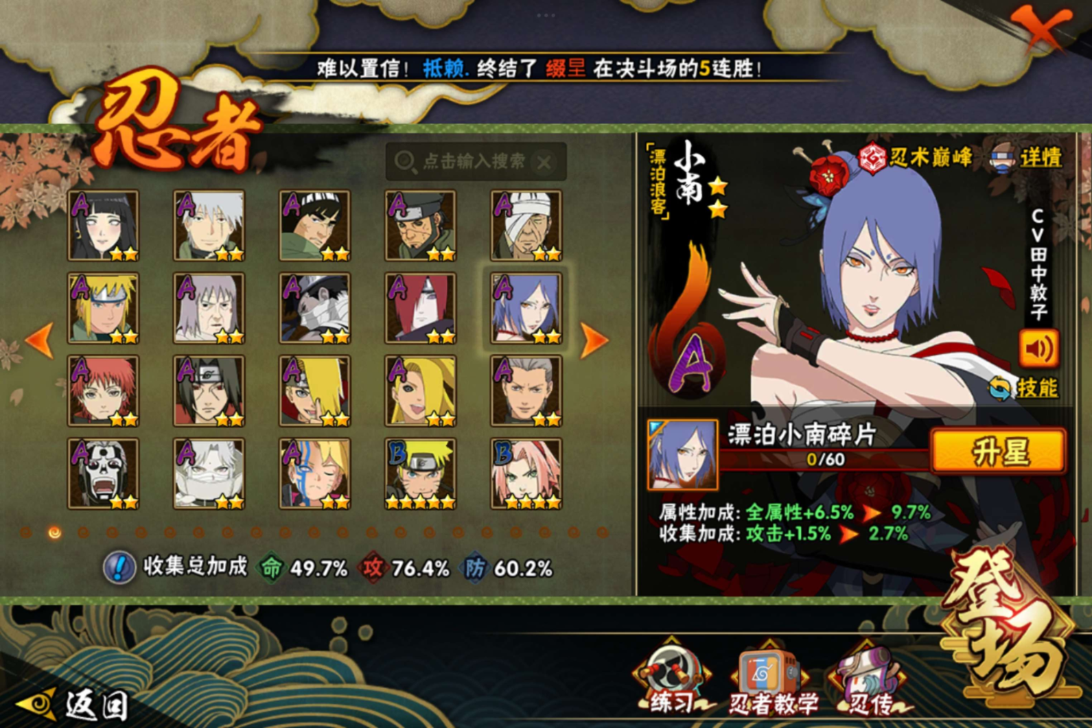 安卓QQ-可二次-S忍者数:8- A忍者数:26 卑留呼「火之意志继承者」(2星) 宇智波佐助「疾风传咒印」(2星) 小南「漂泊浪客」(2星),
